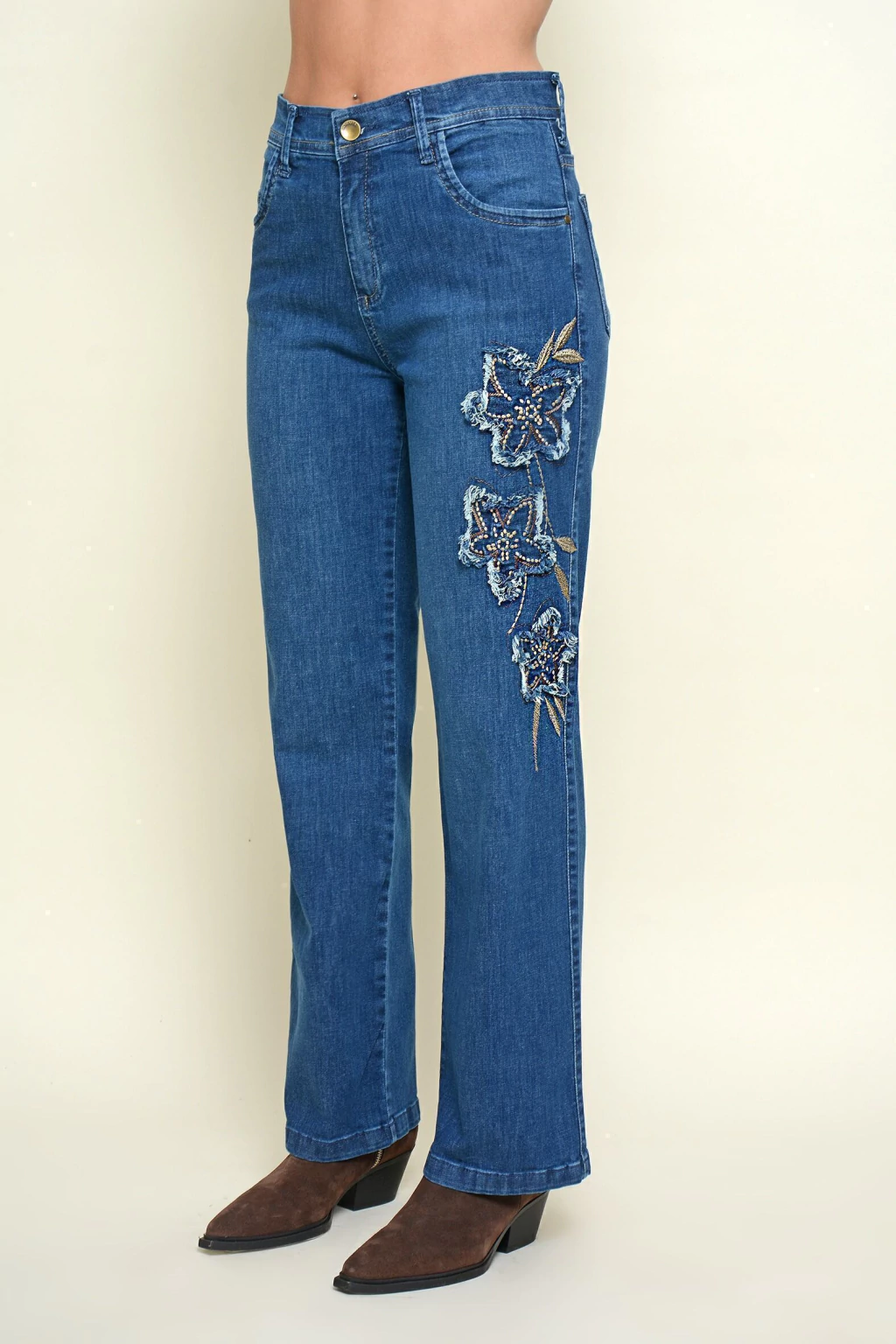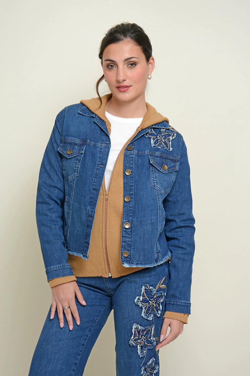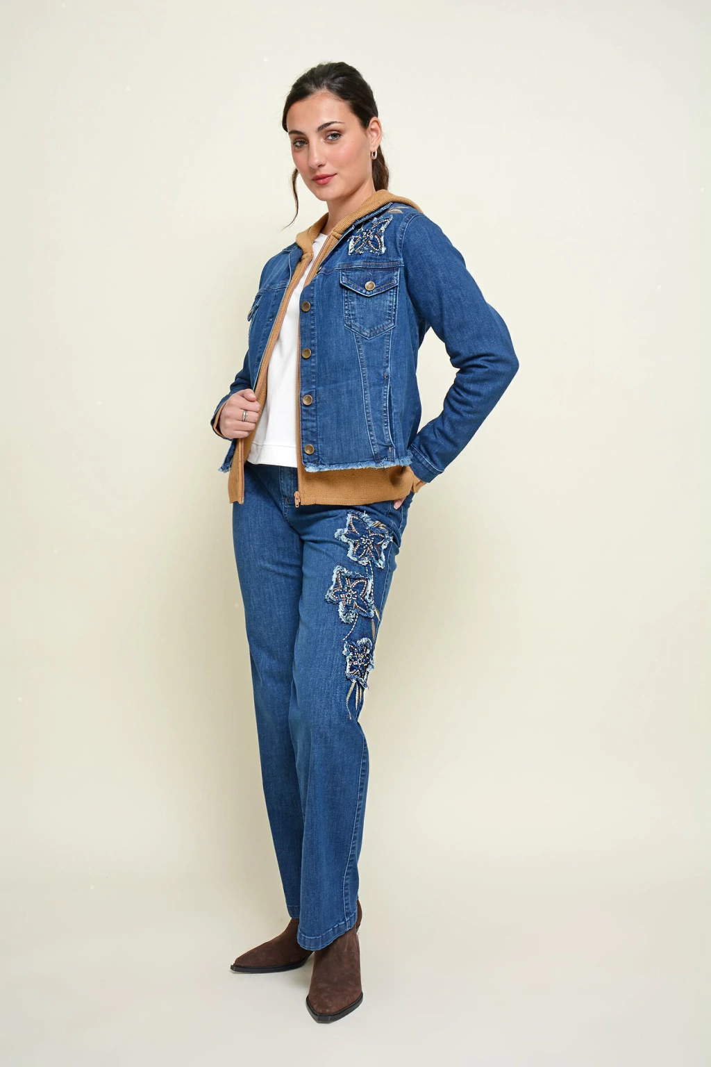 Corte: campera recta, con detalle de flores bordadas y desflecadas