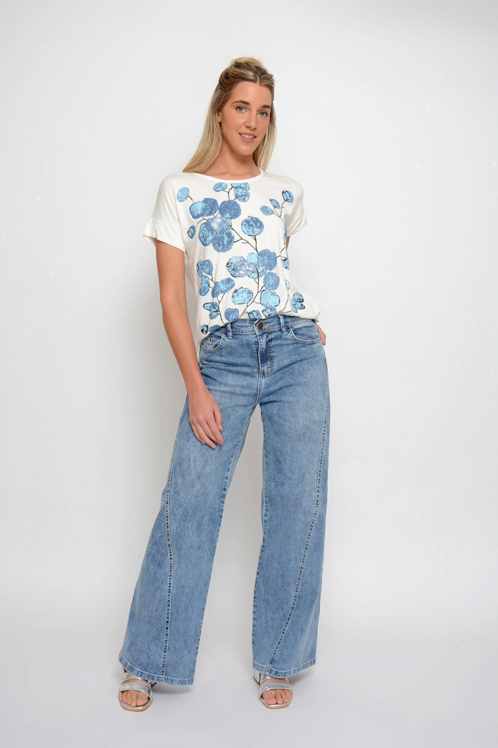 PANTALÓN DE JEAN ELASTIZADO TIRO ALTO, CORTE ANCHO, DETALLE DE COSTURA CRUZANDO LA PIERNA