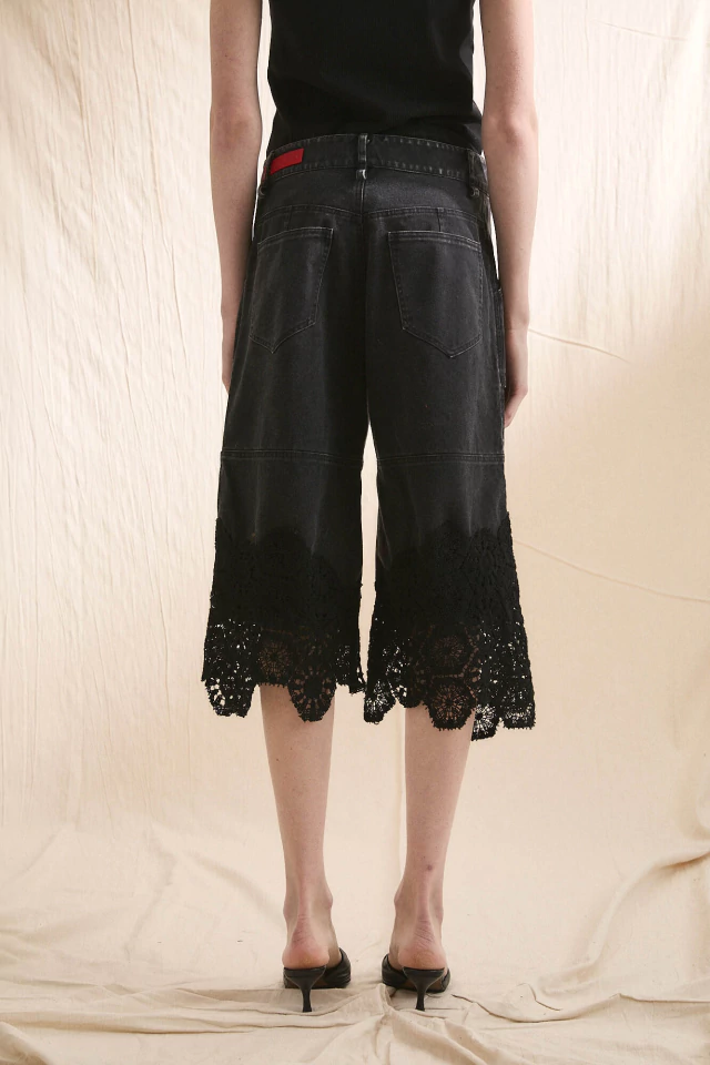Bermuda confeccionada en denim de algodón con detalle de guipiure calado a la altura de la rodilla, que aporta un toque artesanal y femenino. De corte clásico y estructura liviana, combina la practicidad del jean con la delicadeza del encaje, ideal para looks casuales con estilo.