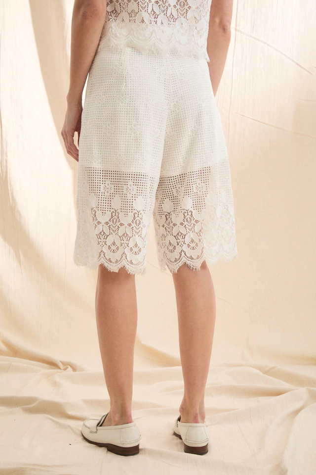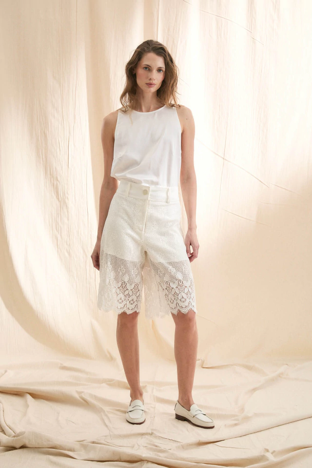 Esta bermuda de gabardina combinada con tela calada destaca por su diseño único y contemporáneo. La mezcla de texturas aporta un aire sofisticado y fresco, mientras que su interior forrado hasta media pierna asegura comodidad y un acabado impecable. Una prenda versátil que eleva cualquier look con elegancia y modernidad.