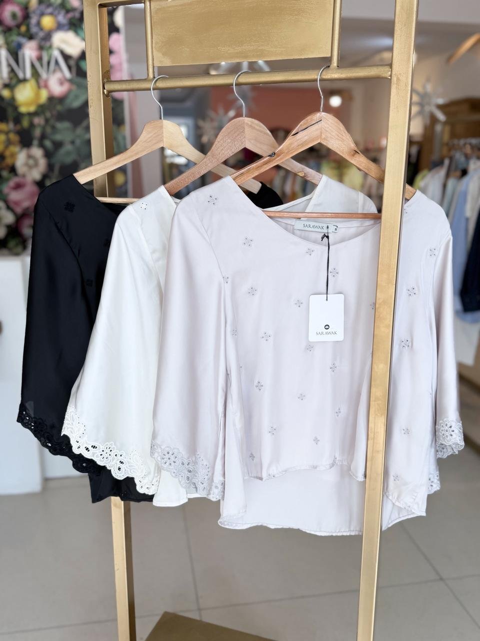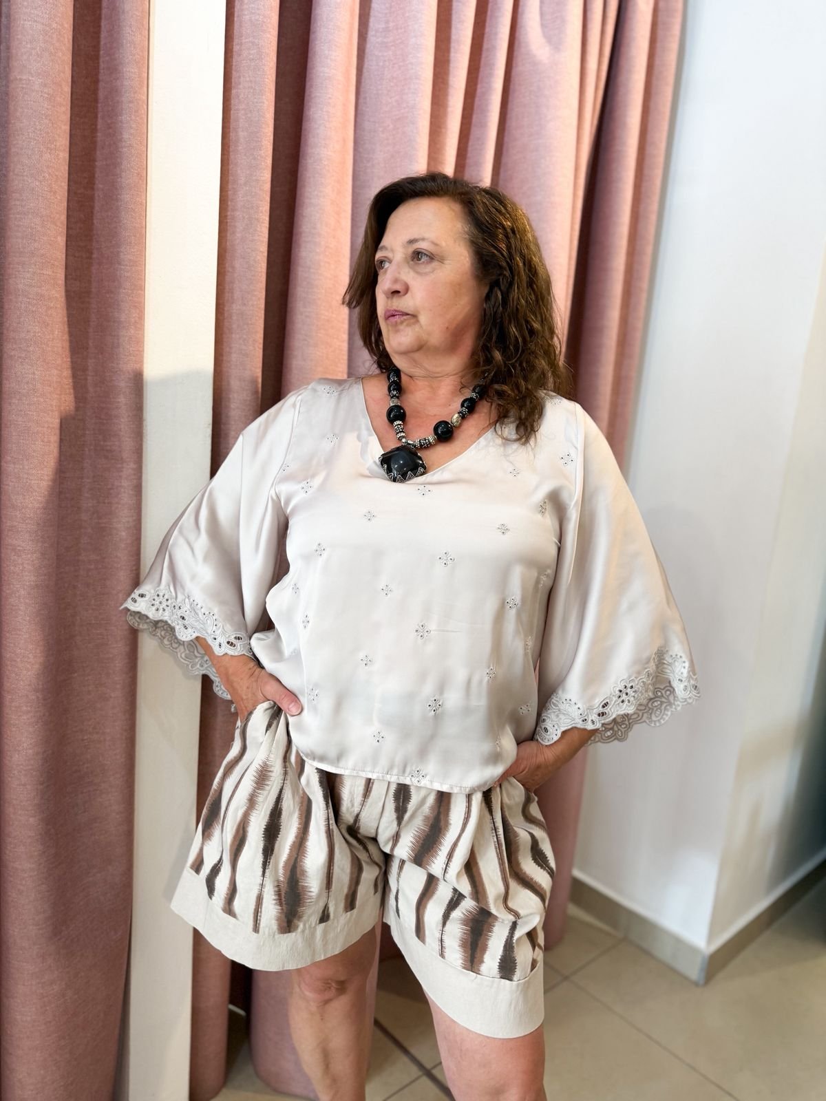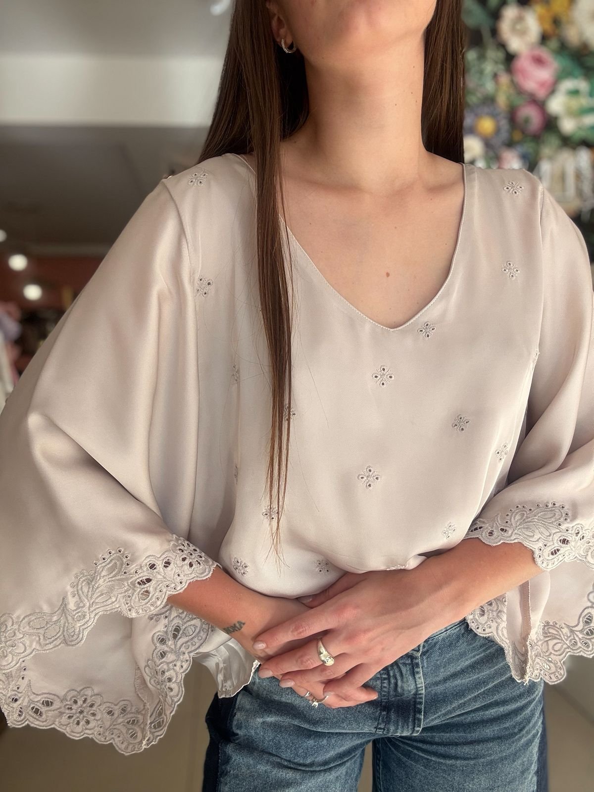 BLUSA DE SEDA BORDADA AL TONO, CON MANGA ACAMPANADA Y BORDADA. IDEAL PARA DARLE UN TOQUE FINO A CUALQUIER LOOK
