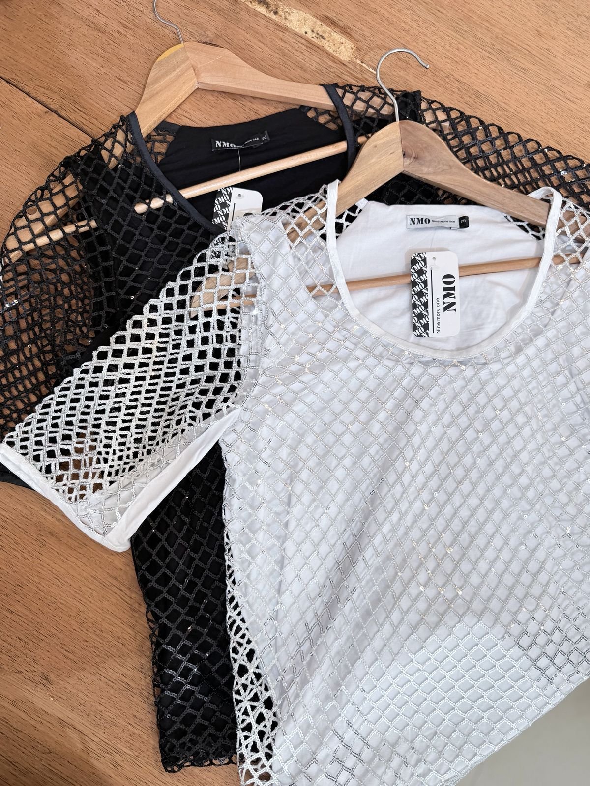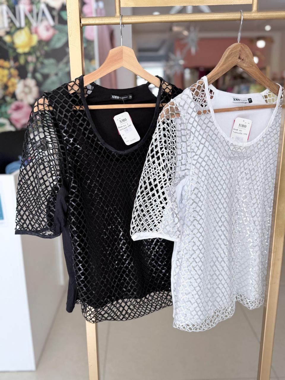MUSCULOSA BASE ELASTIZADA CON DISEÑO EN RED Y LENTEJUELAS CUBRIENDO TORSO Y GENERANDO MANGAS CORTAS PRINCESAS