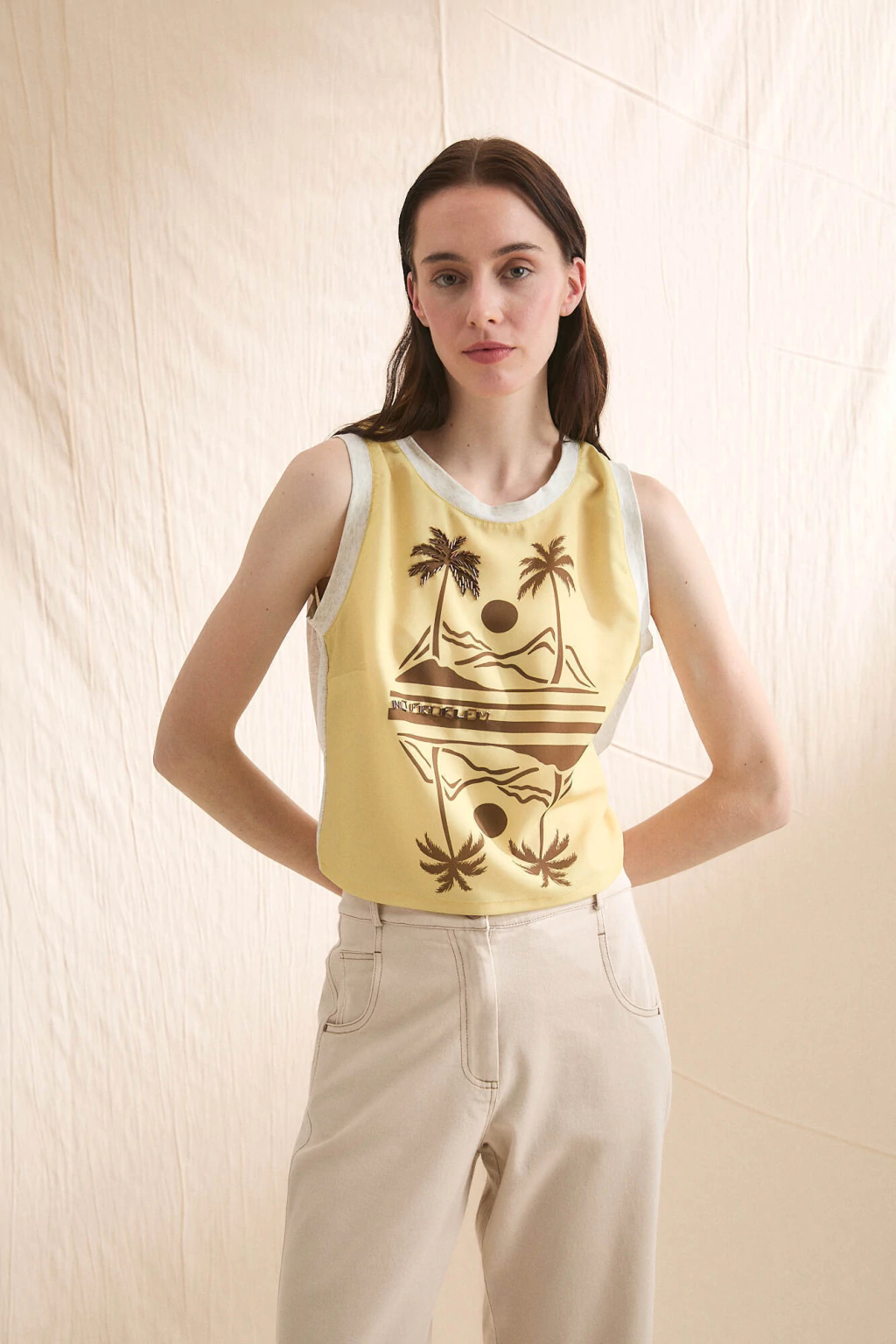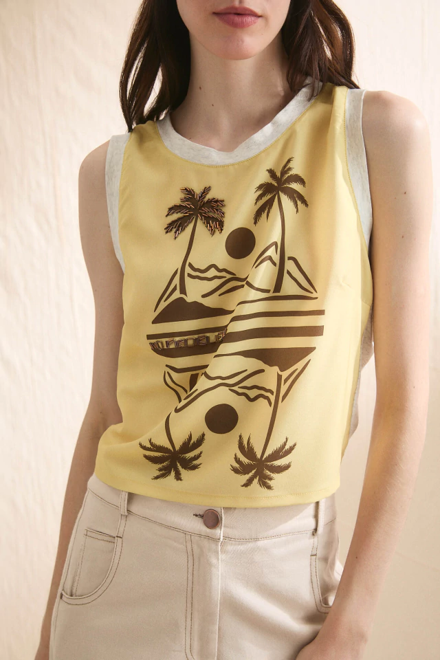 Esta musculosa combina crepé estampado bordado al frente con espalda de algodón melange, logrando un equilibrio perfecto entre textura, diseño y confort. La terminación en lazo para anudar en la espalda aporta un detalle femenino y versátil, permitiendo ajustar el calce a gusto. Una prenda liviana y moderna, ideal para sumar un toque distintivo a tus looks casuales.