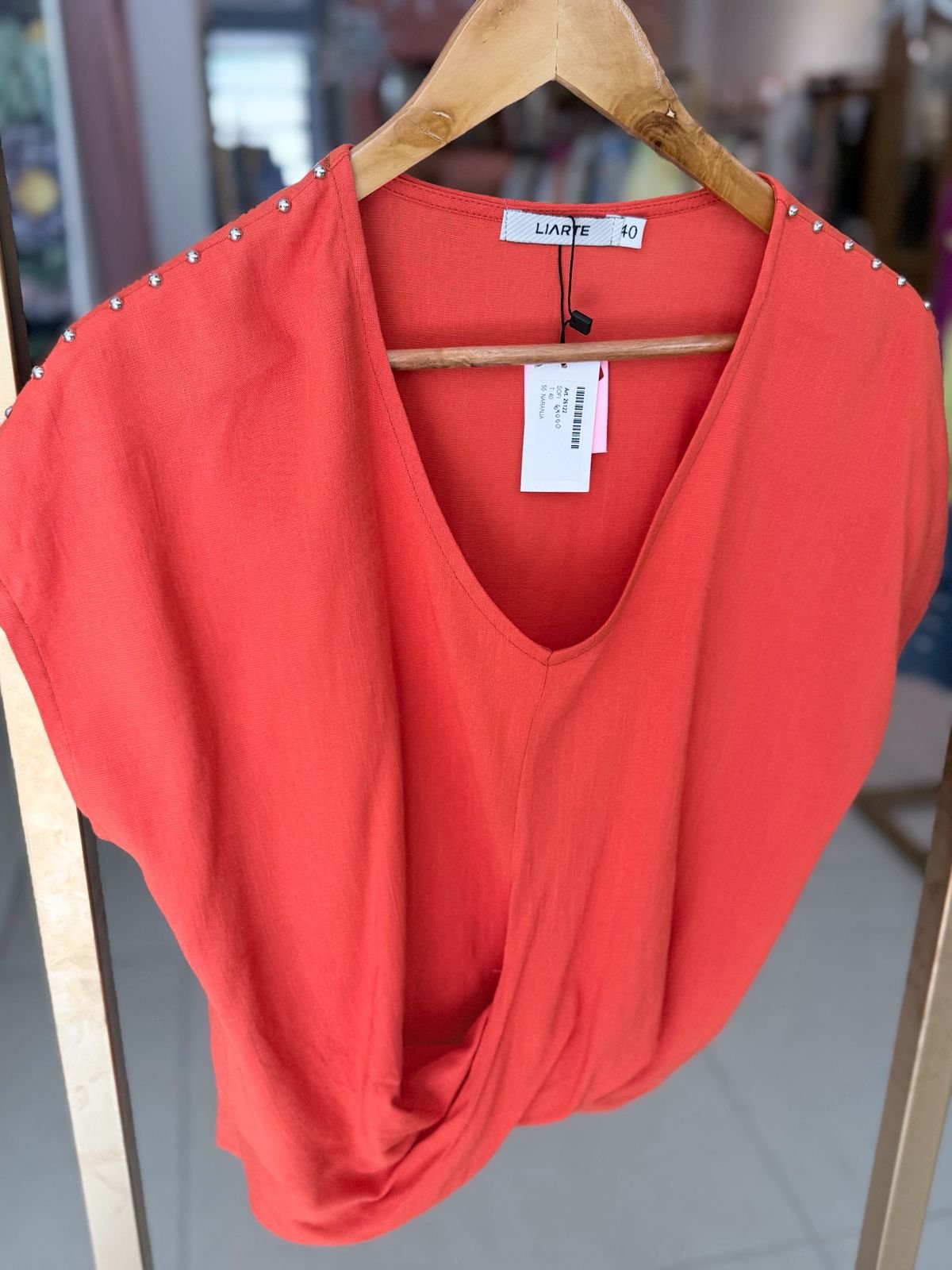 BLUSA DE LINO COLOR CORAL, CON DETALLE DE TACHAS EN LA CONA DE HOMBROS, ESCOTE V Y FRUNCE FRONTAL COMO DETALLE