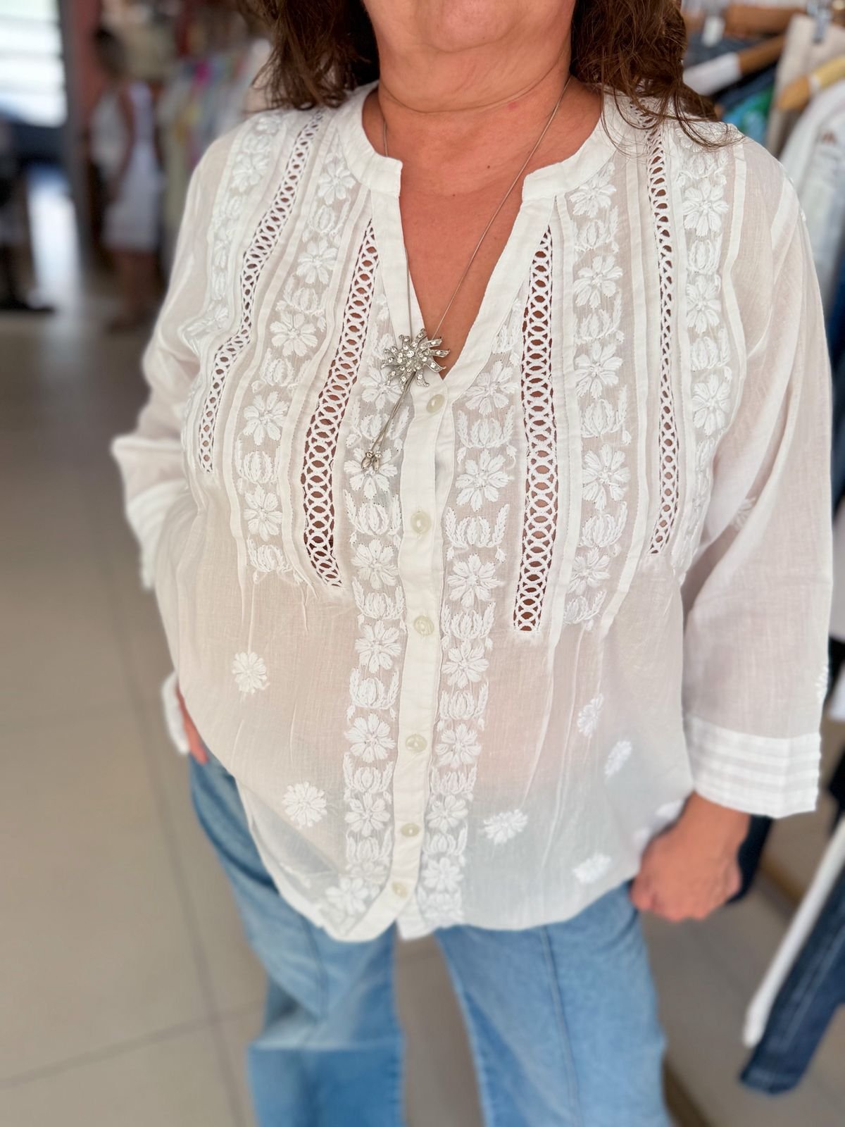 ESCOTE MAO CORTE V. SE CARACTERIZA POR SU DISEÑO CON RELIEVE, BORDADO A TONO Y DETALLES CALADOS
