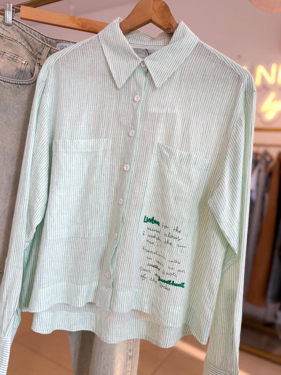 En el frente, presenta unos mega bolsillos y cuenta con el detalle especial de una estampa manuscrita presente en la parte delantera y espalda de la camisa. El largo de la misma es a primera cadera y su prendedura es con botones a tono.