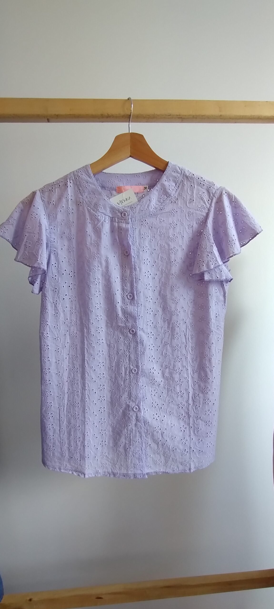 CAMISA MANGA CORTA CON VOLADO, ESCOTE REDONDO. SU PRENDEDURA ES CON BOTONES A TONO Y SU FULL BRODERIE EN COLOR LAVANDA LA CARACTERIZA.