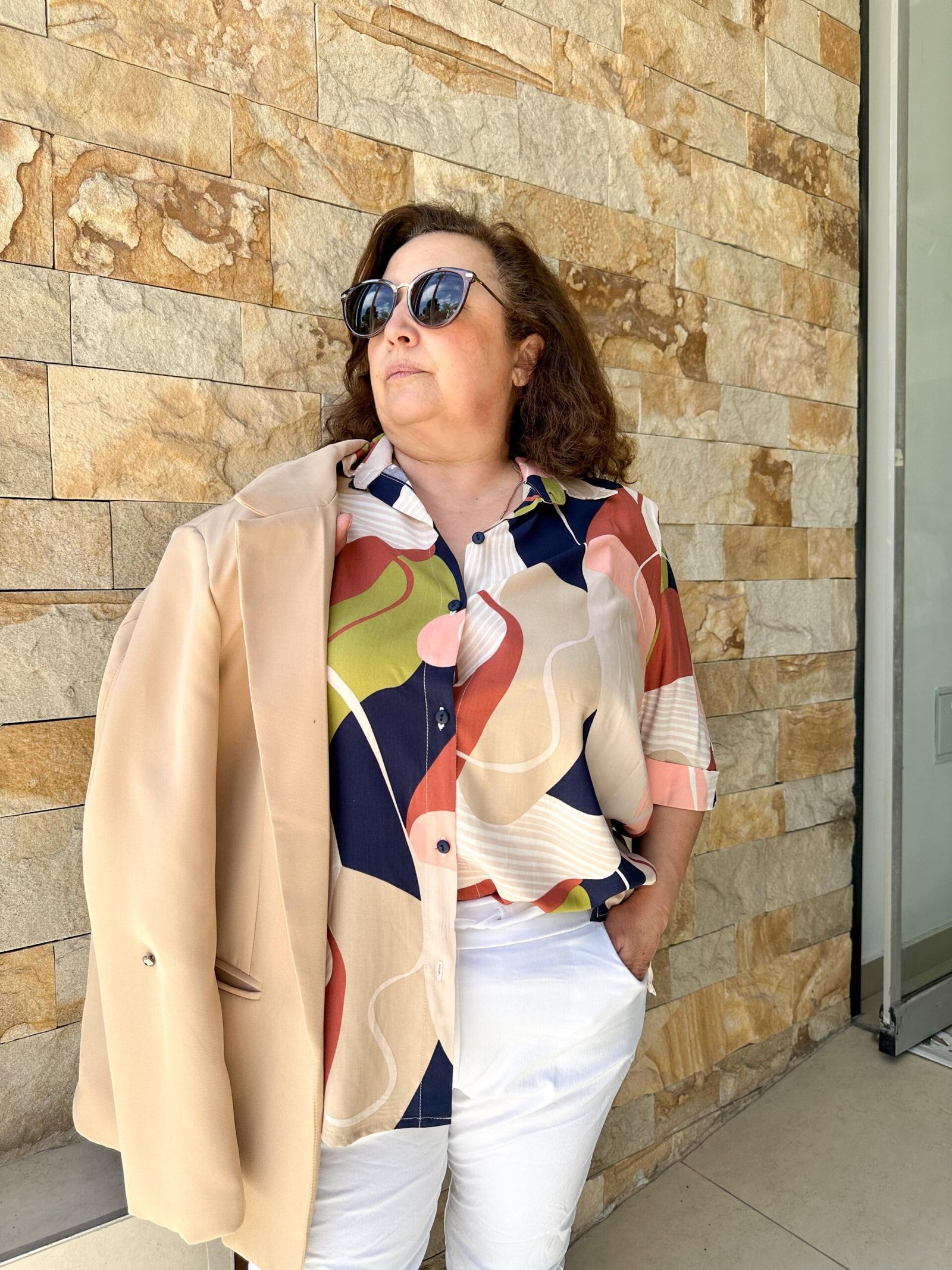 CAMISA DE FIBRANA ESTAMPADA, MANGA TRES CUARTOS CON AGARRE DE BOTÓN.