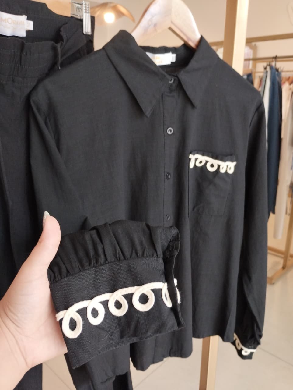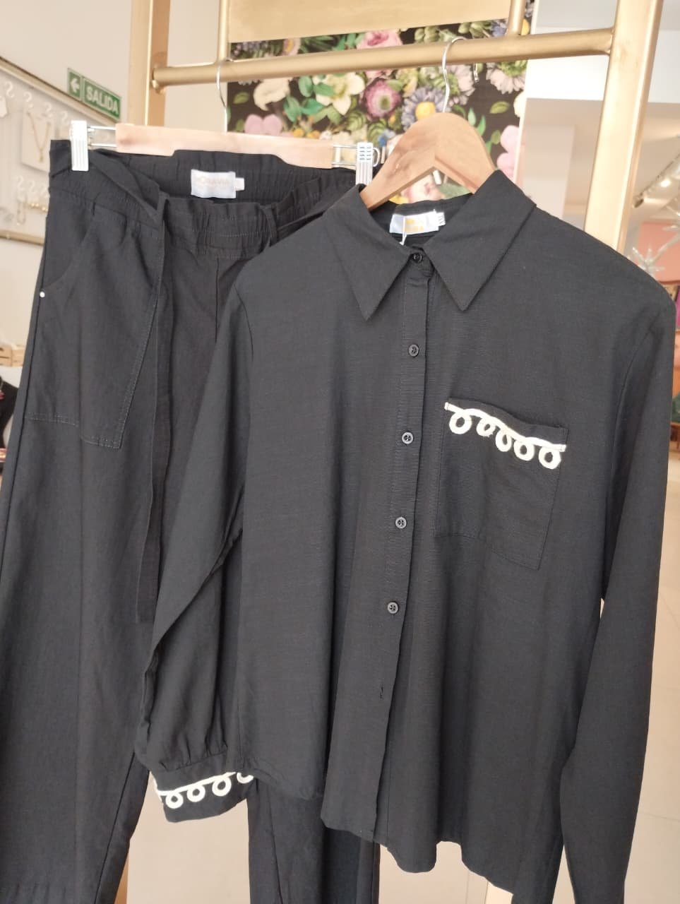 PRENDEDURA FRONTAL CON BOTONES A TONO. SE CARACTERIZA POR SU BORDADO A CONTRATONO EN PUÑOS Y BOLSILLO FRONTAL