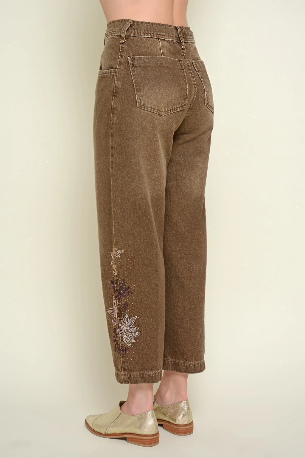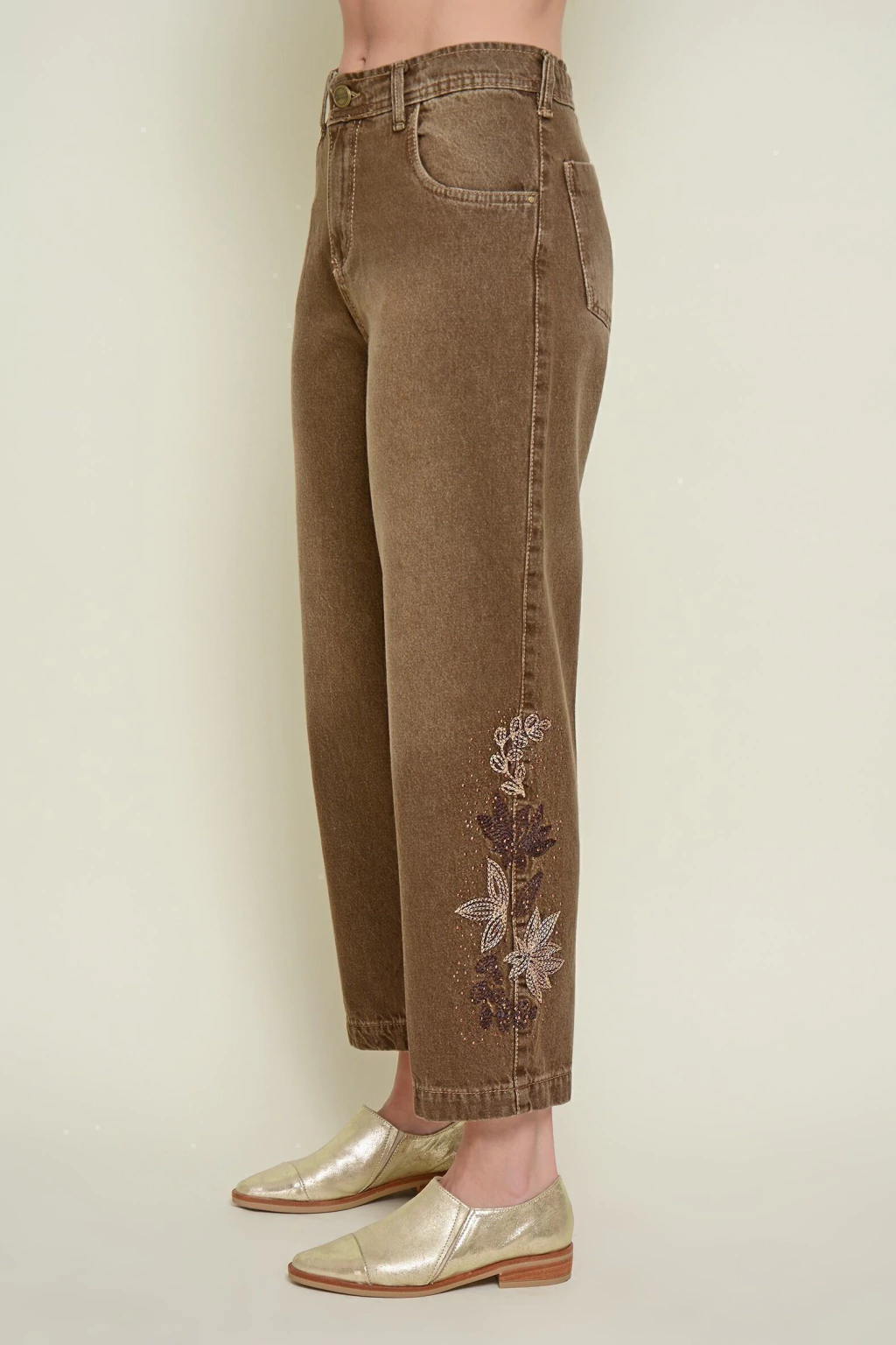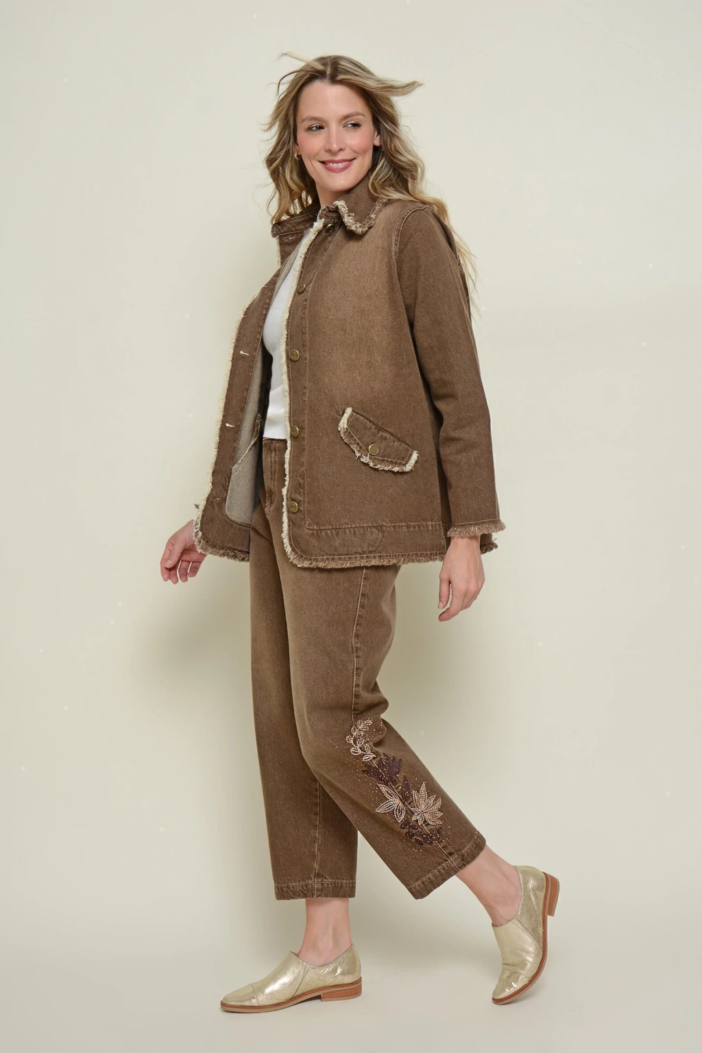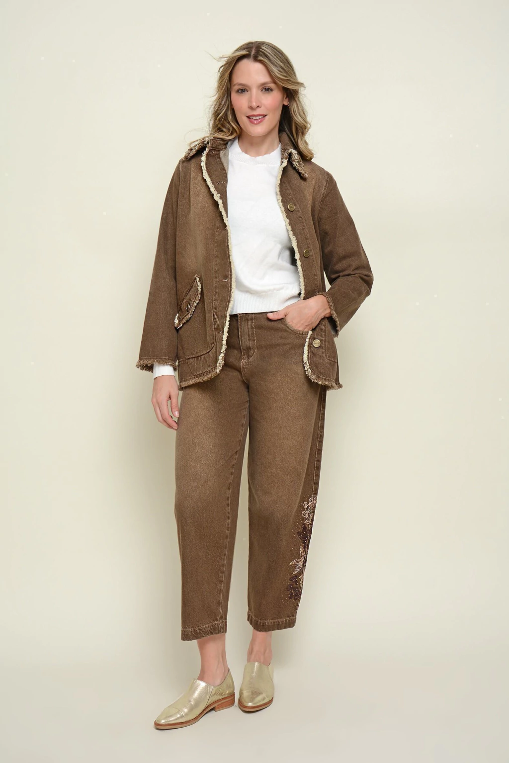 Corte: ancho, largo, con botones y bolsillo, bordes desflecados, con bordado y transfer de flores beige y chocolate en espalda