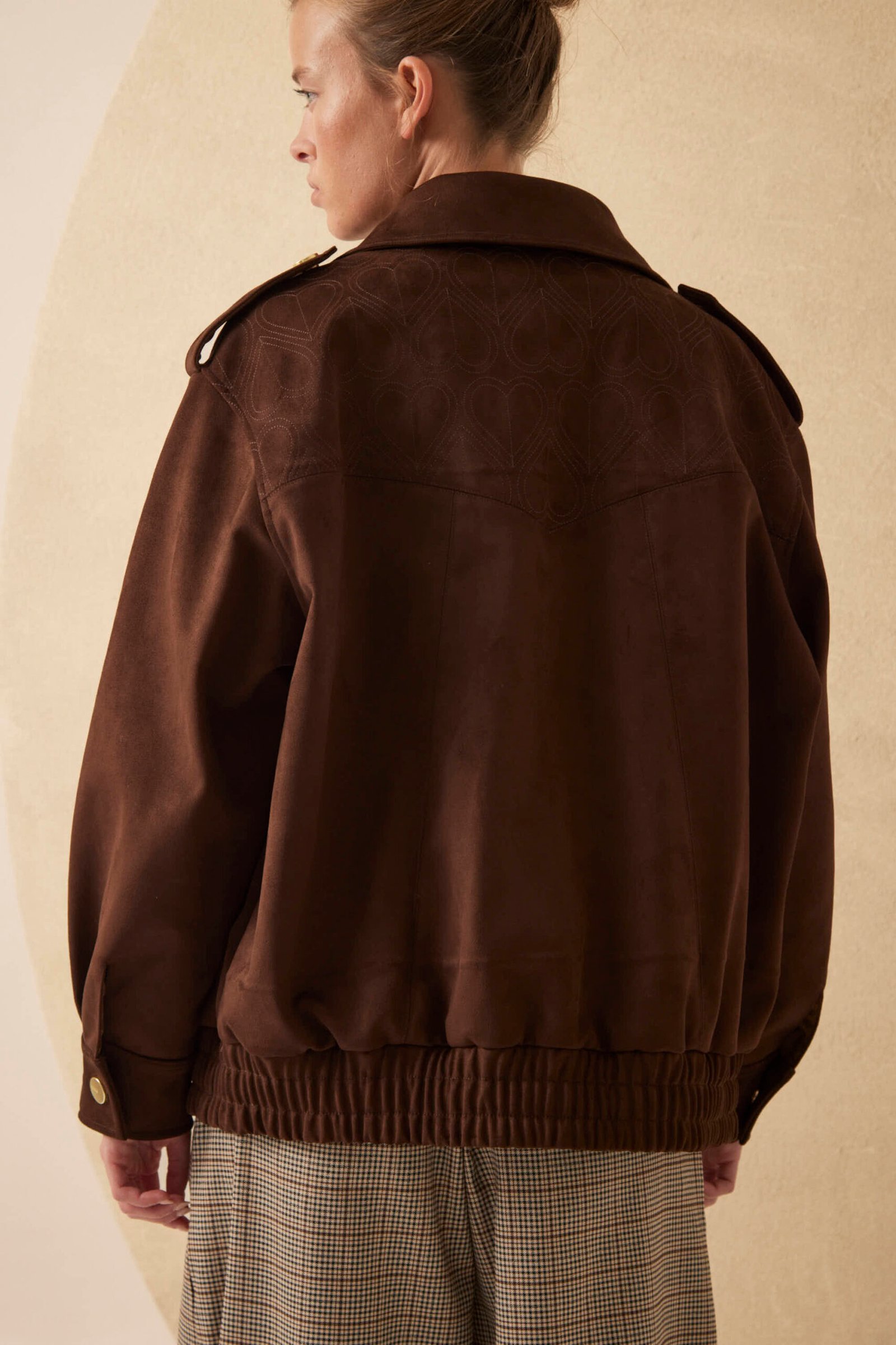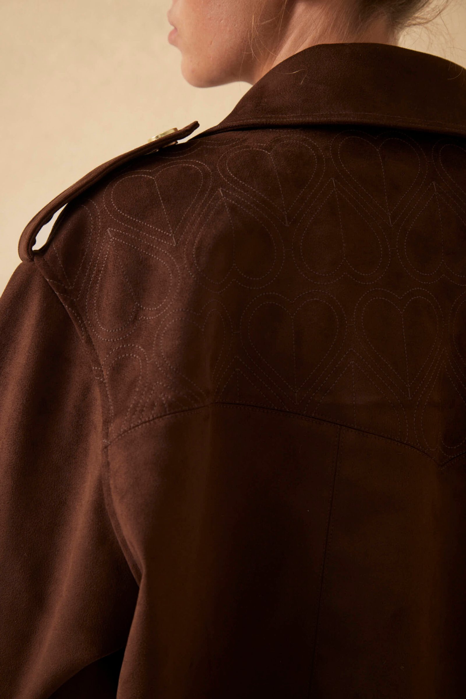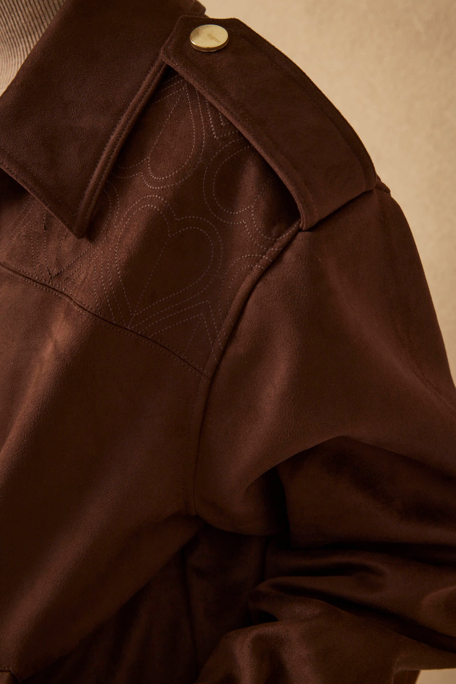 ¿Por qué esta prenda es para mí? Porque una campera de gamuza oversize es un statement. El pattern bordado Millie en el canesú es un detalle artesanal premium, los snaps en presillas y puños le dan funcionalidad y el conjunto es pura sofisticación relajada.