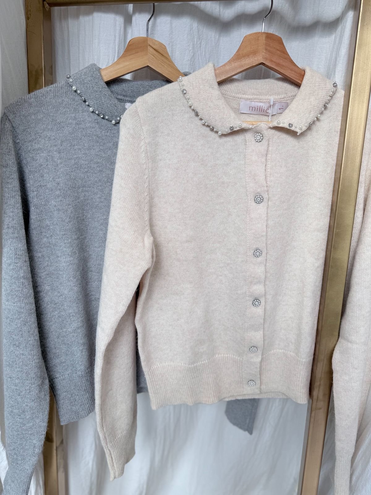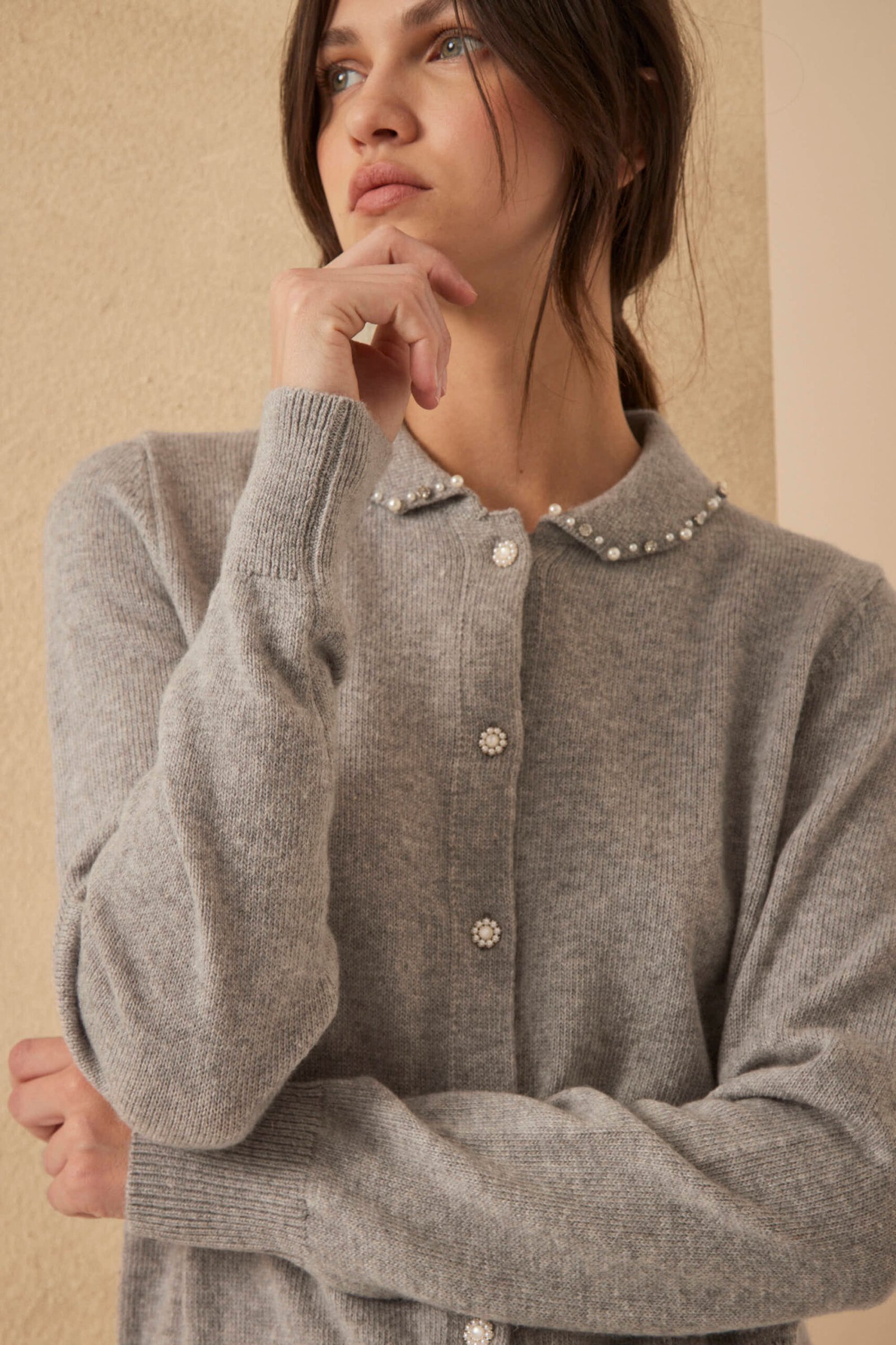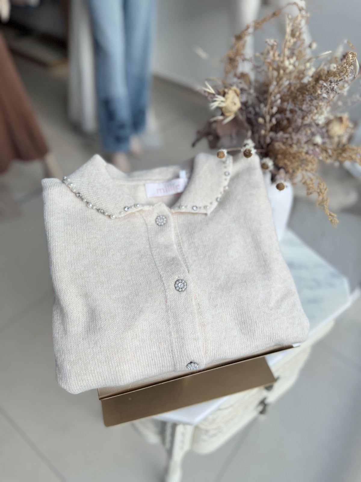 Joyas en cada borde. El Cardigan Olivia tiene cuello camisero con terminación de joyas en todo el contorno. Botones joya y avío metálico Millie. Elegancia que brilla.