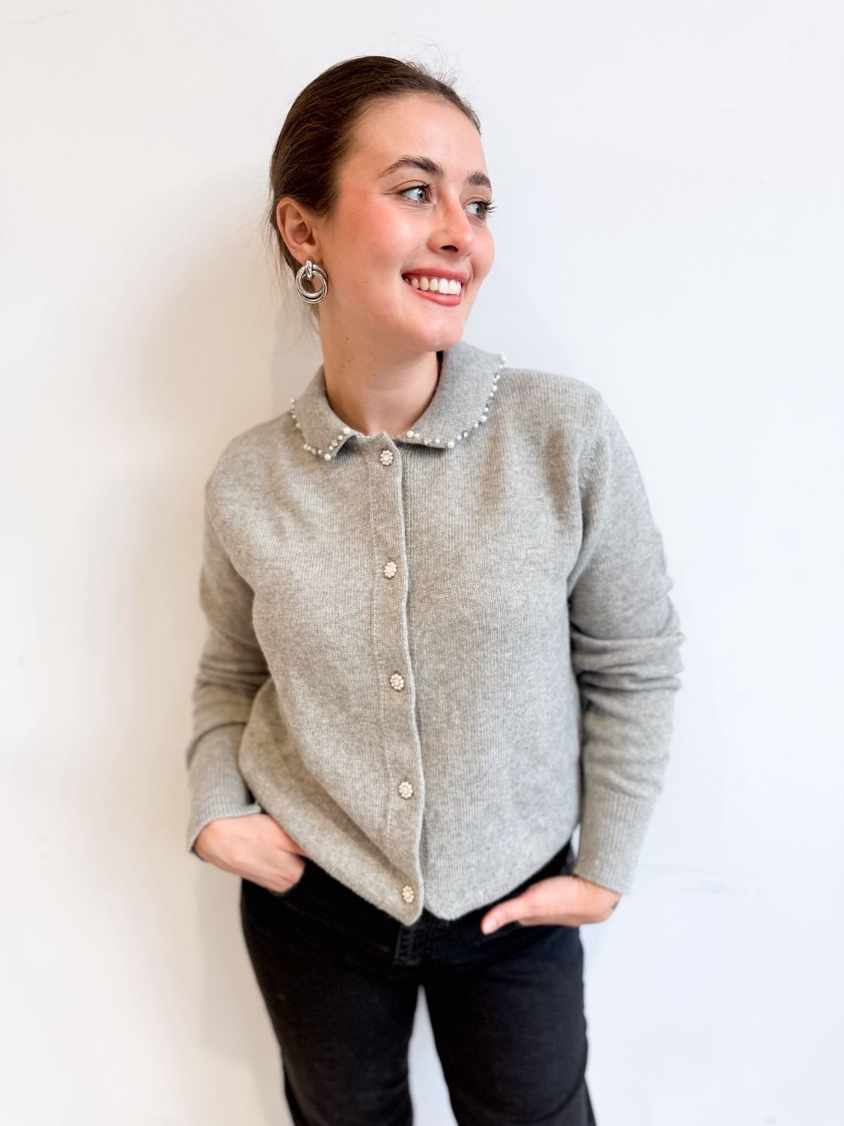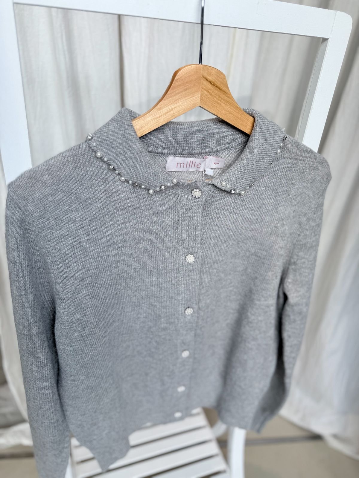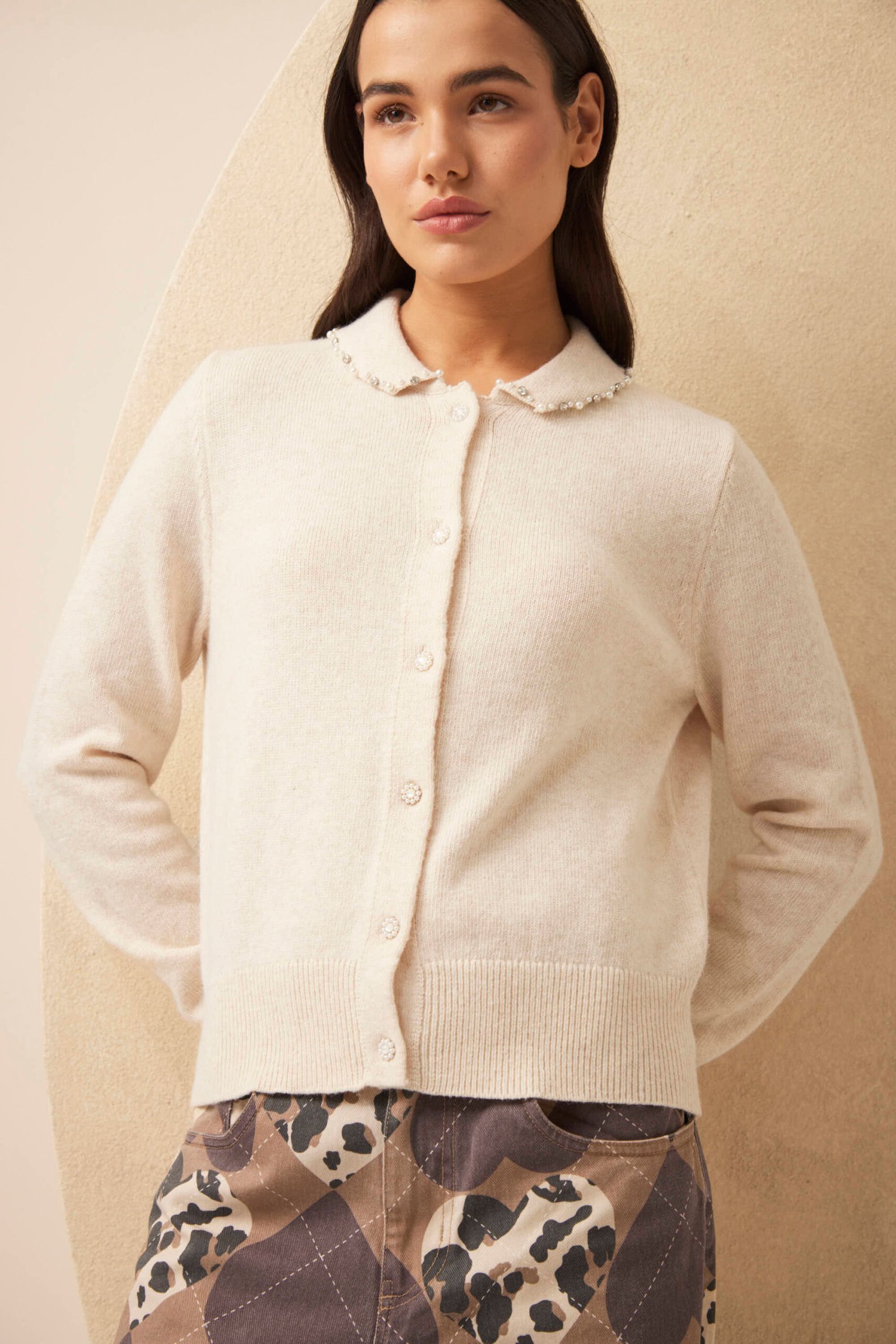 Joyas en cada borde. El Cardigan Olivia tiene cuello camisero con terminación de joyas en todo el contorno. Botones joya y avío metálico Millie. Elegancia que brilla.