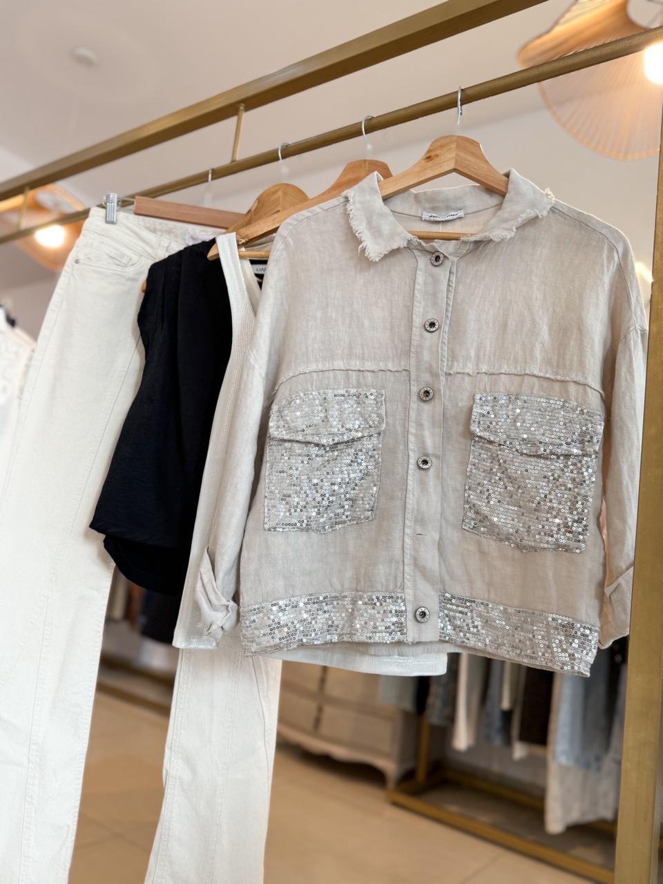 CHAQUETA DE LINO ITALIANA CORTE OVERSIZE. PRENDEDURA FRONTAL CON BOTONES METÁLICOS, BOLSILLOS FRONTALES Y RECORTE EN LA CINTURA FULL LENTEJUELAS