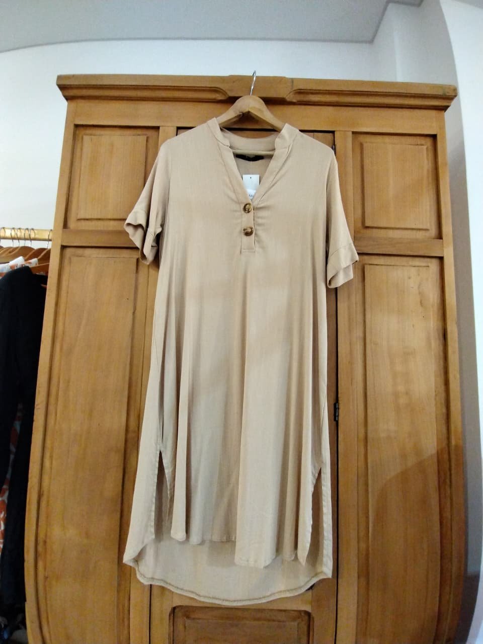 VESTIDO CONFECCIONADO EN SIMIL LINO, ESCOTE V CON DETALLE DE BOTONES CAREY.