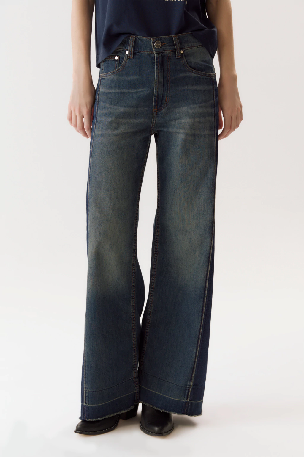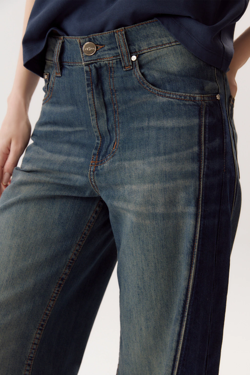 La prenda se destaca por el cambio de tono que lleva en los laterales y el ruedo como resultado del lavado.