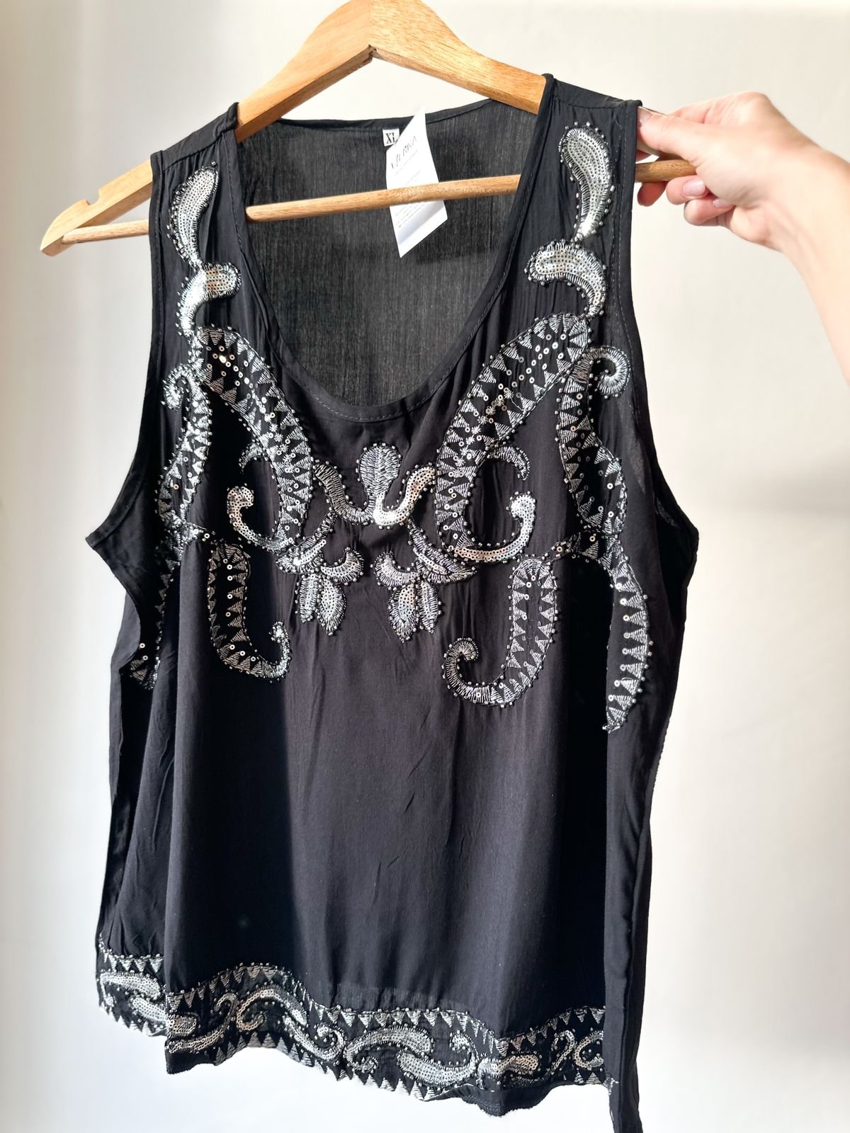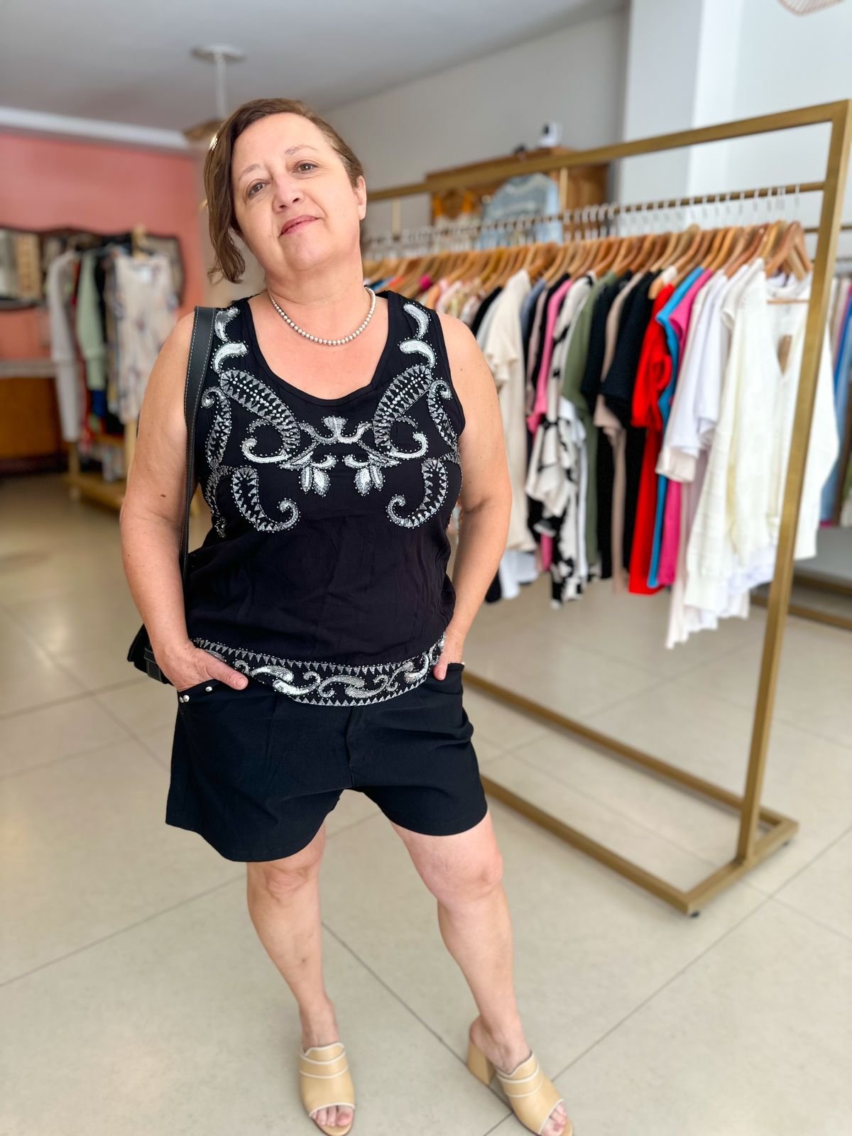 MUSCULOSA DE FIBRANA NEGRA CON BORDADO EN L A PARTE FRONTAK Y MOSTRACILLAS COLOR PLATEADO Y PELTRE