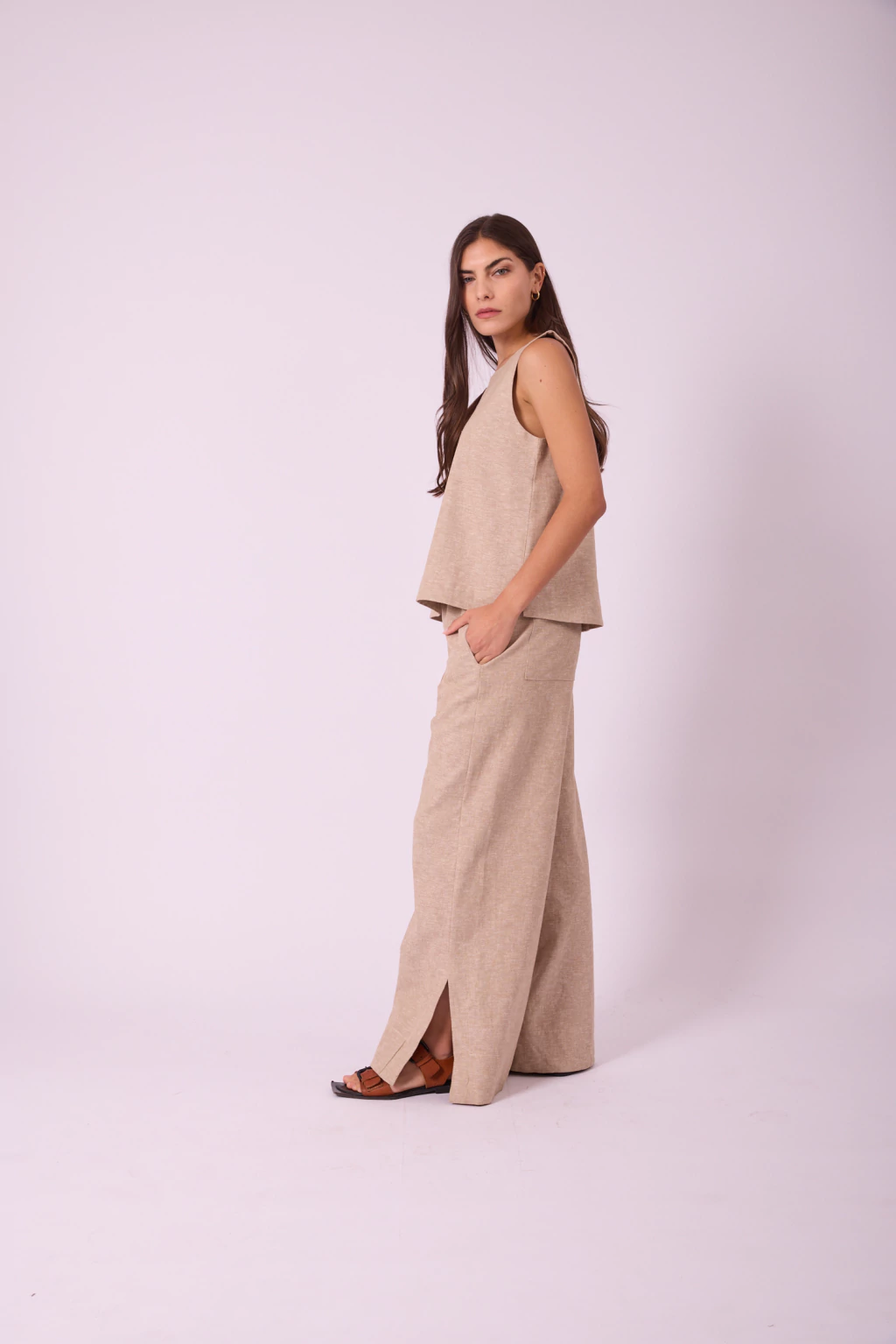 PANTALÓN PALAZZO CONFECCIONADO EN LINO DE ALGODÓN CON CINTURA ELASTIZADA, BOLSILLOS LATERALES