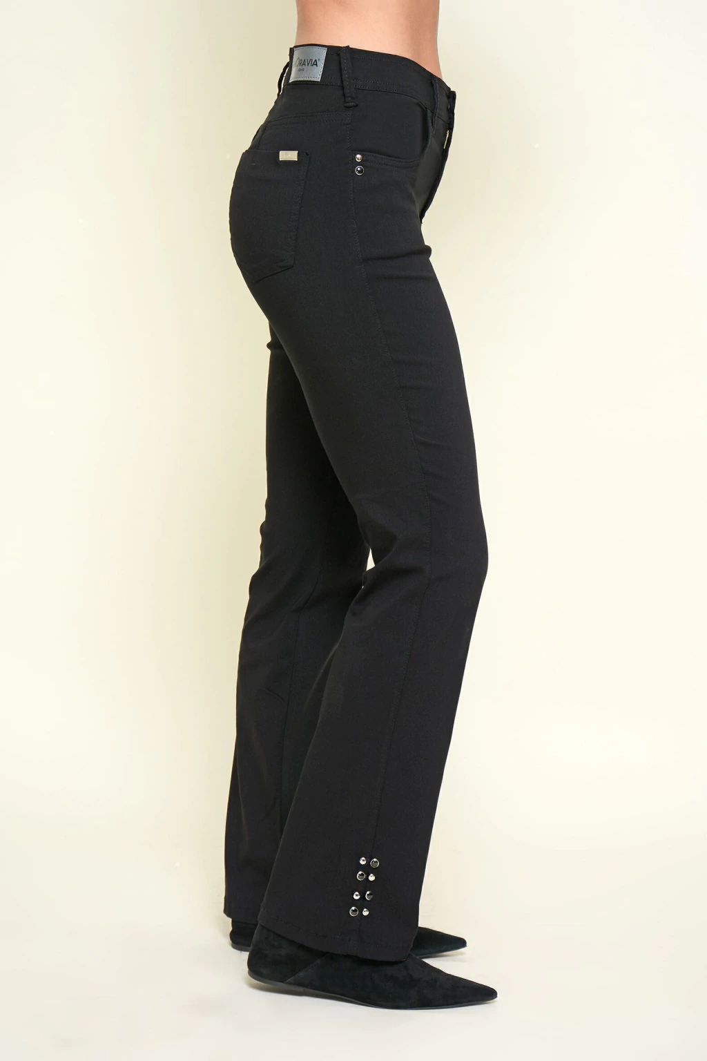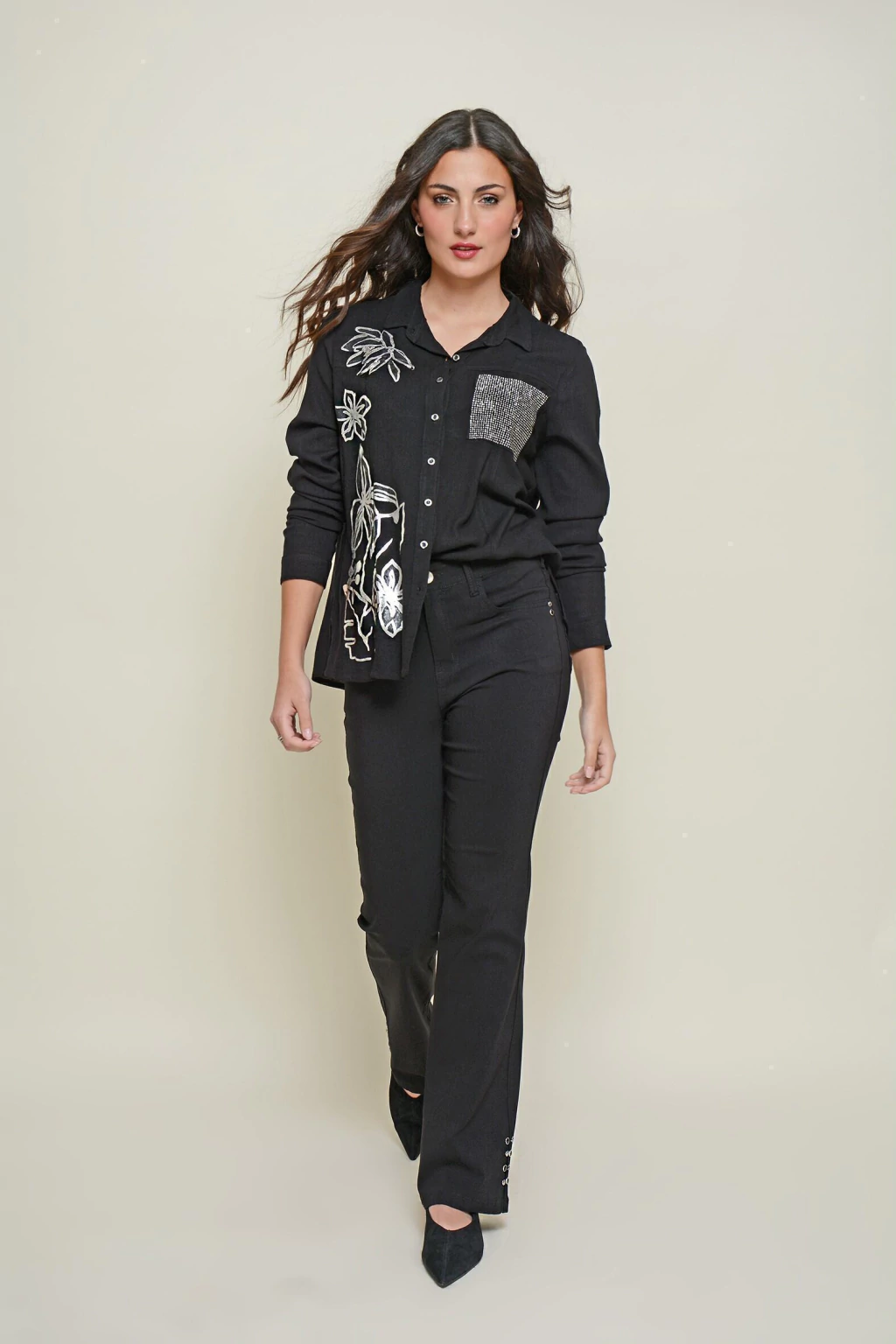PANTALÓN DE BENGALINA ELASTIZADA, DE CORTE RECTO CON DETALLE DE TACHAS EN BOLSILLOS Y BOTAMANGA