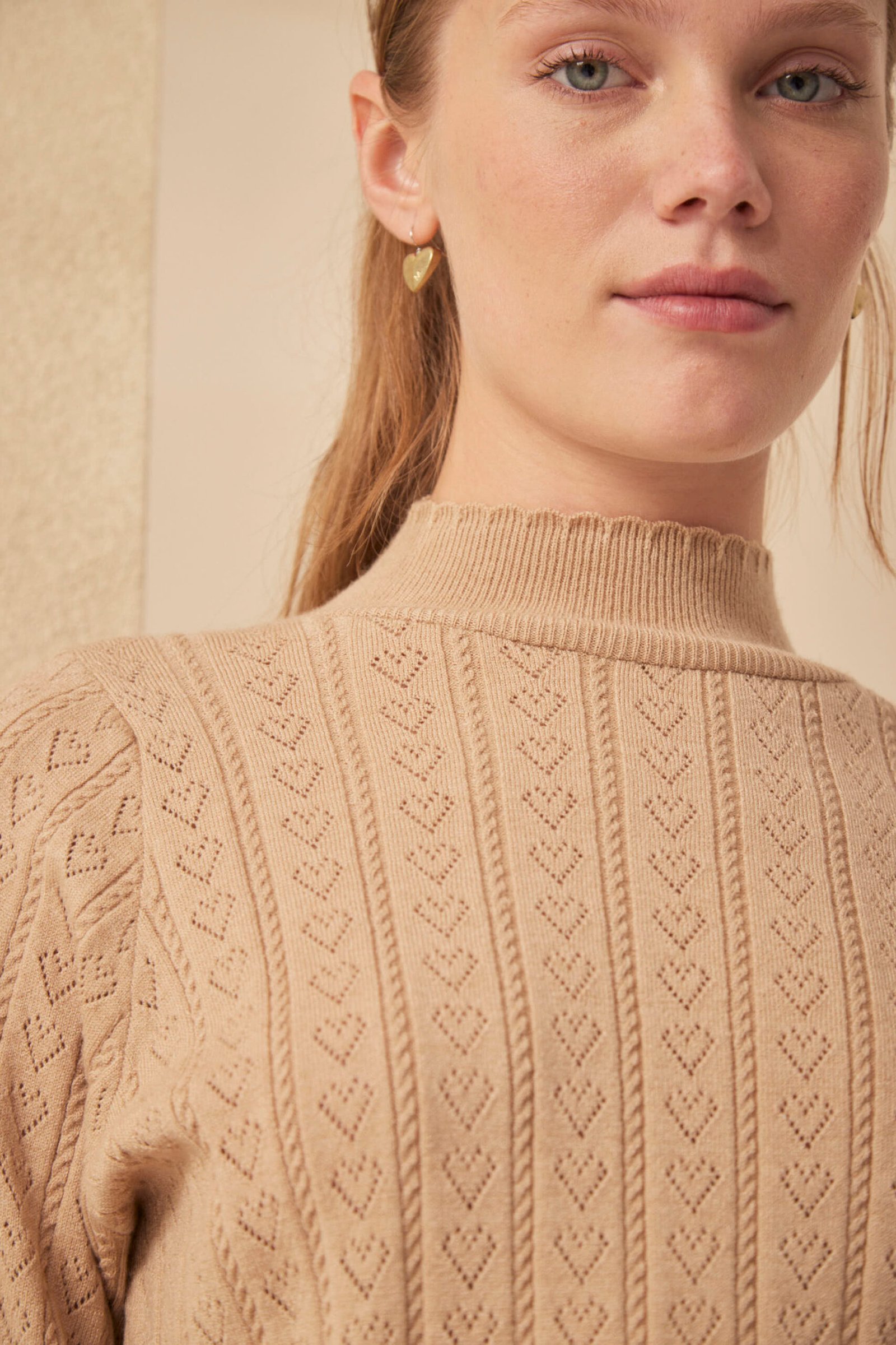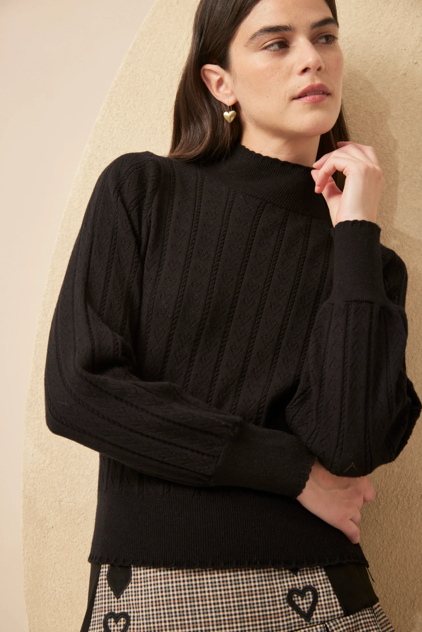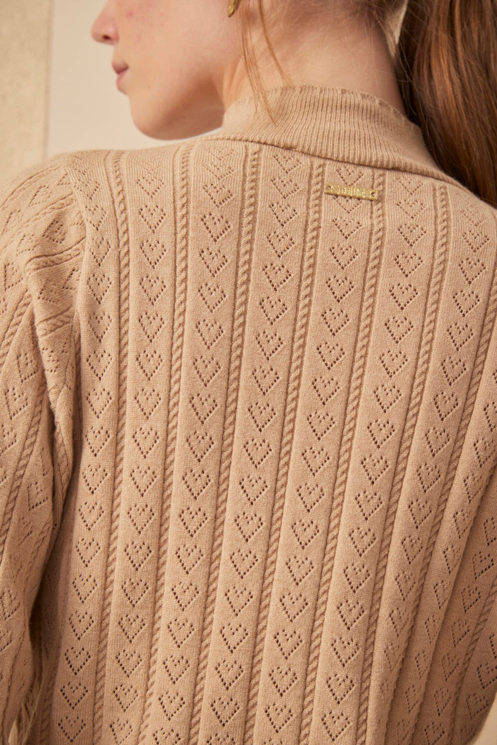 La Polera Alfie es puro detalle artesanal. Tejida en punto de corazones y trenzas, con onditas en cuello, mangas y puños, tiene manga princesa y ese aire romántico que define a Millie. Lleva avío metálico Millie. Parte de los Esenciales Millie. Composición: viscosa, nylon, elastano y lana. Suave, con estructura y textura.