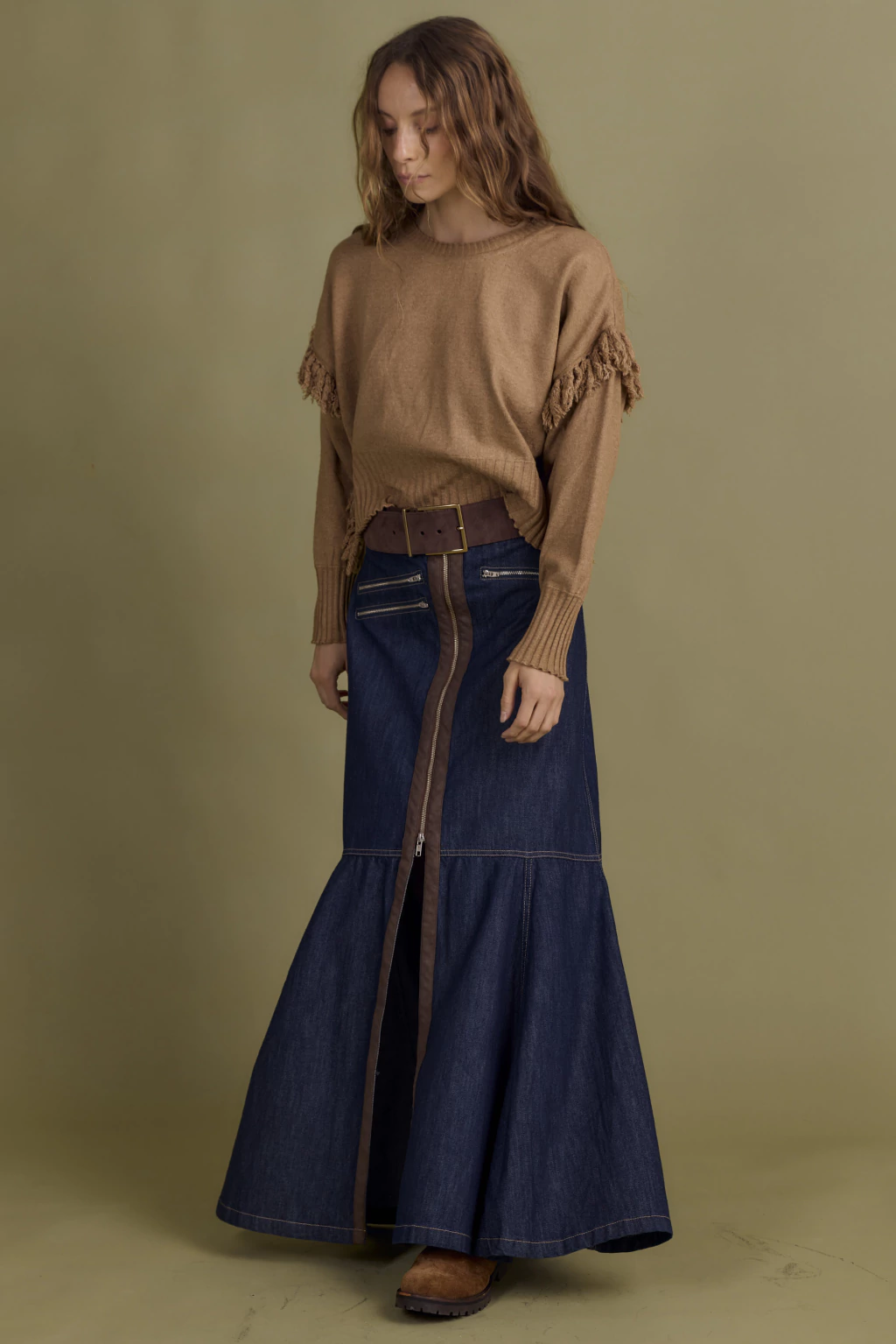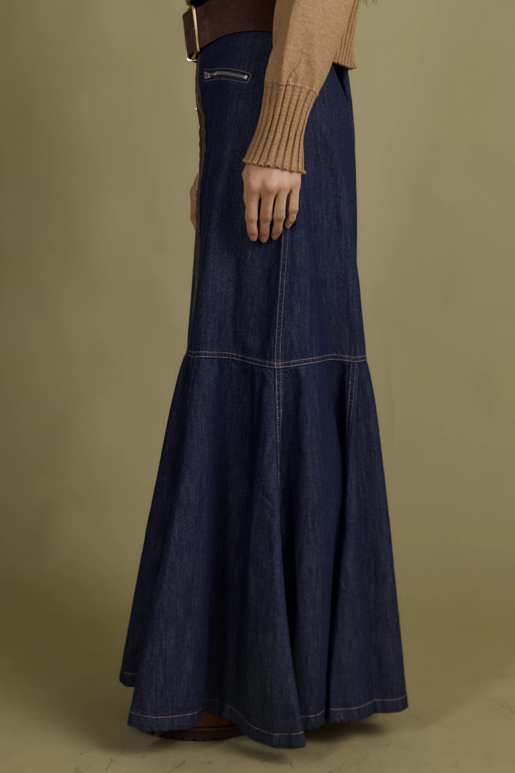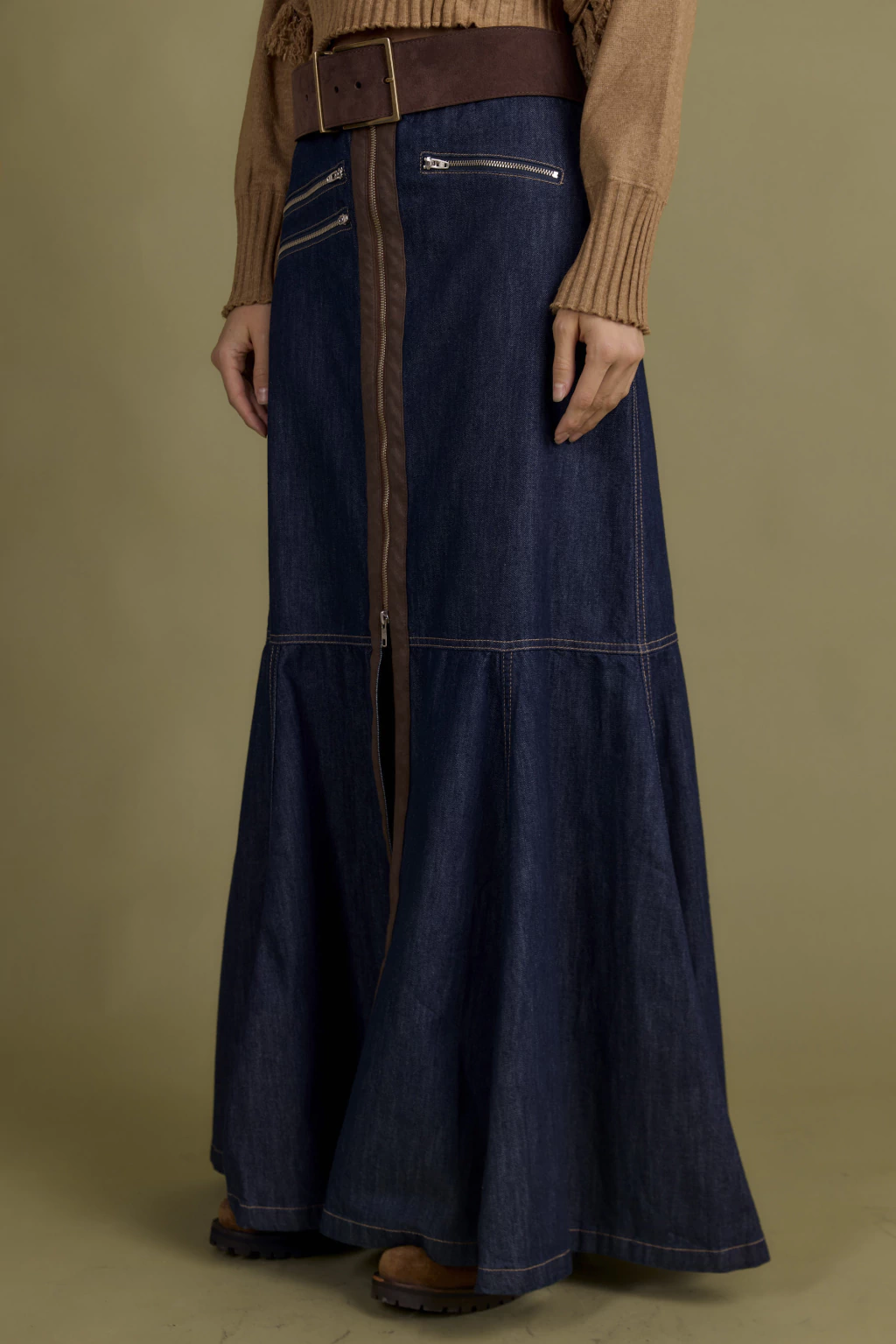 En centro de acceso posee cierre metálico que recorre desde la mitad de la falda permitiendo generar un tajo central súper canchero.