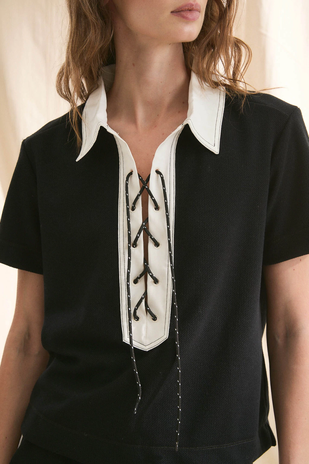 Confeccionada en piqué, con cuello y cartera a contratono que realzan su diseño clásico y elegante. Su escote ncluye un práctico cordón a tono, ofreciendo un detalle sutil y funcional.