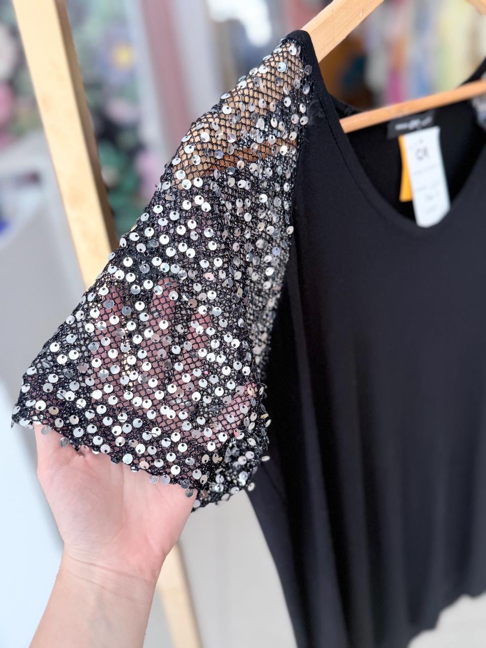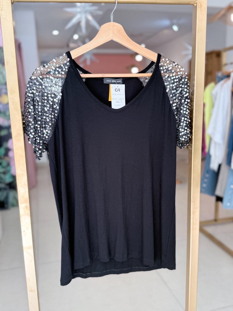 REMERA ESCOTE EN V SUAVE, CON BASE ELASTIZADA LISA. SE CARACTERIZA POR SU DISEÑO DE RED Y LENTEJUELA EN MANGAS