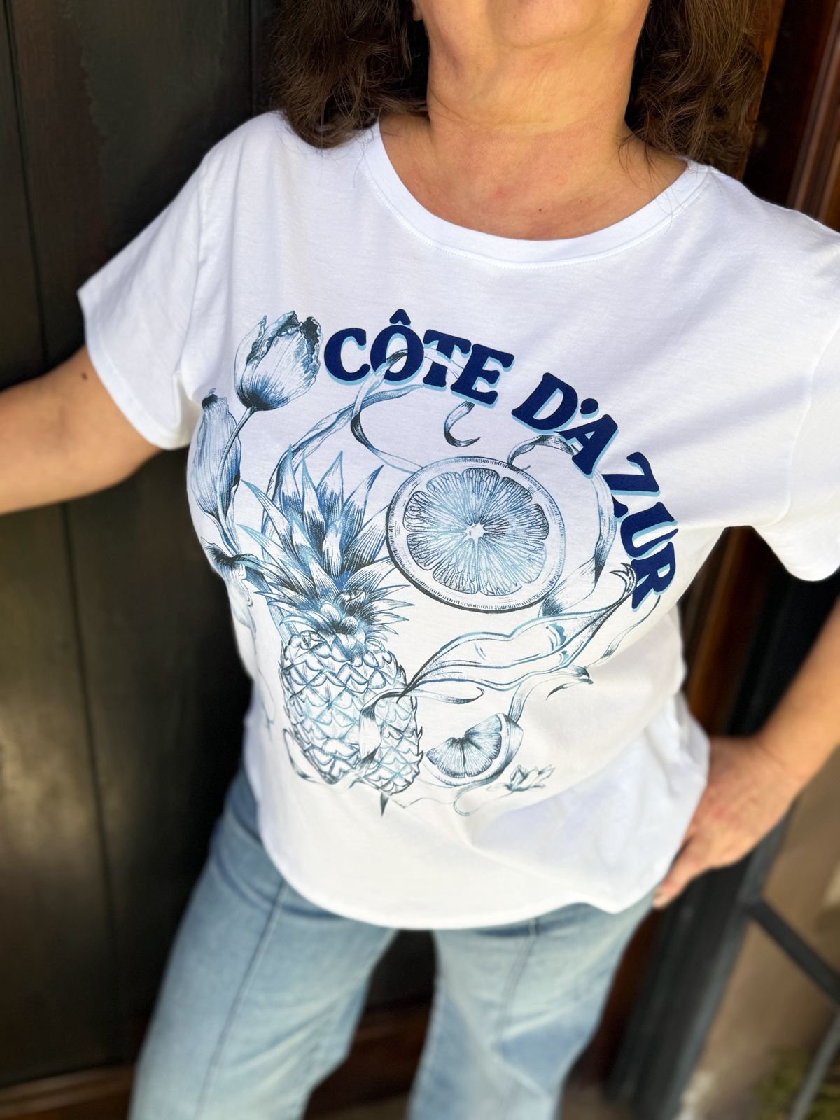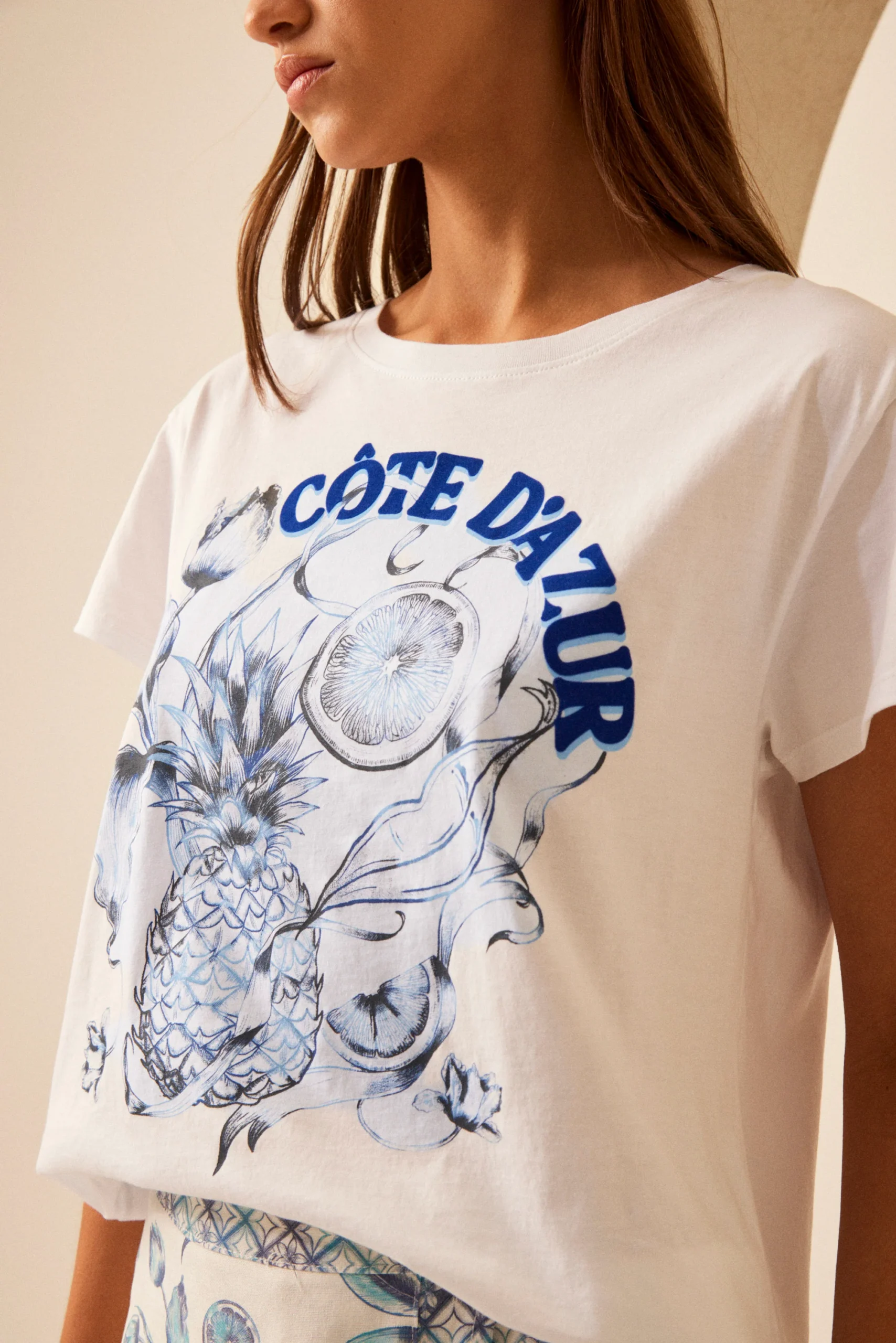 Remera de algodón 100% Pima confeccionada en Perú. Tiene estampa con letras de gamuza en el delantero y grifa metálica Millie en la espalda.