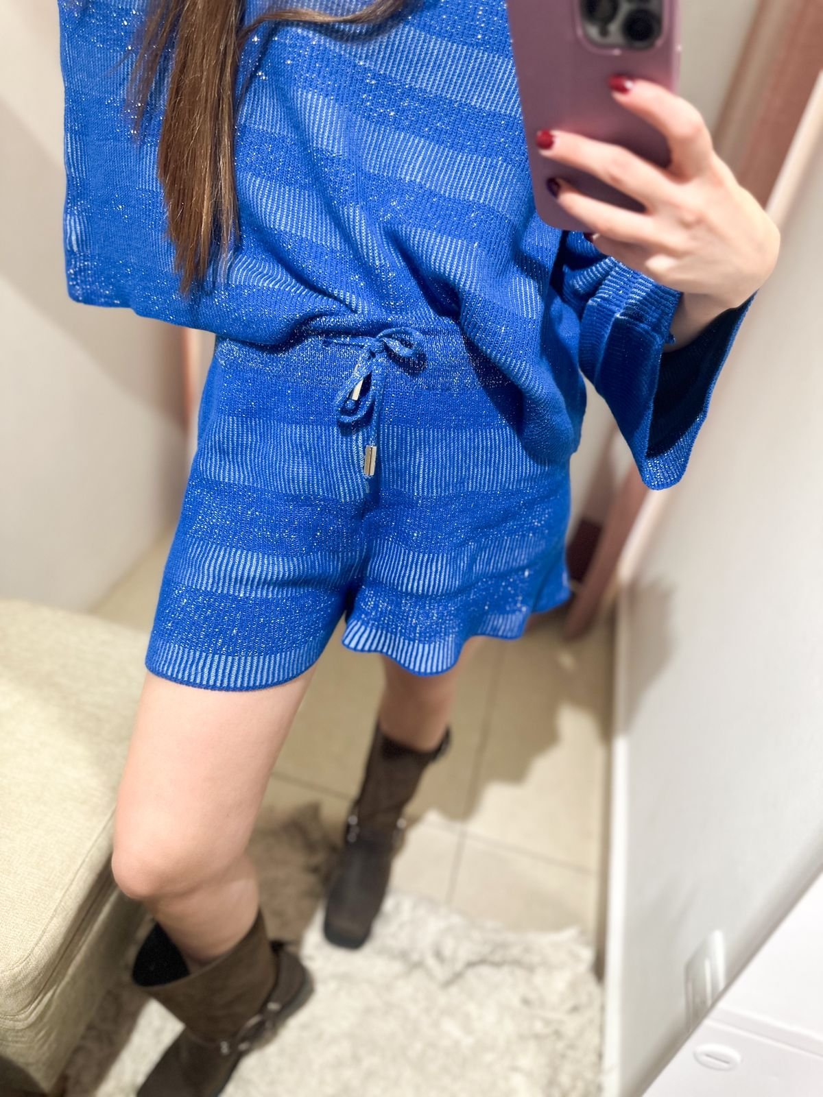 SHORT TEJIDO DE HILO CON DETALLES DE FRANJAS DE LUREX Y DETALLE DE AJUSTE EN CINTURA