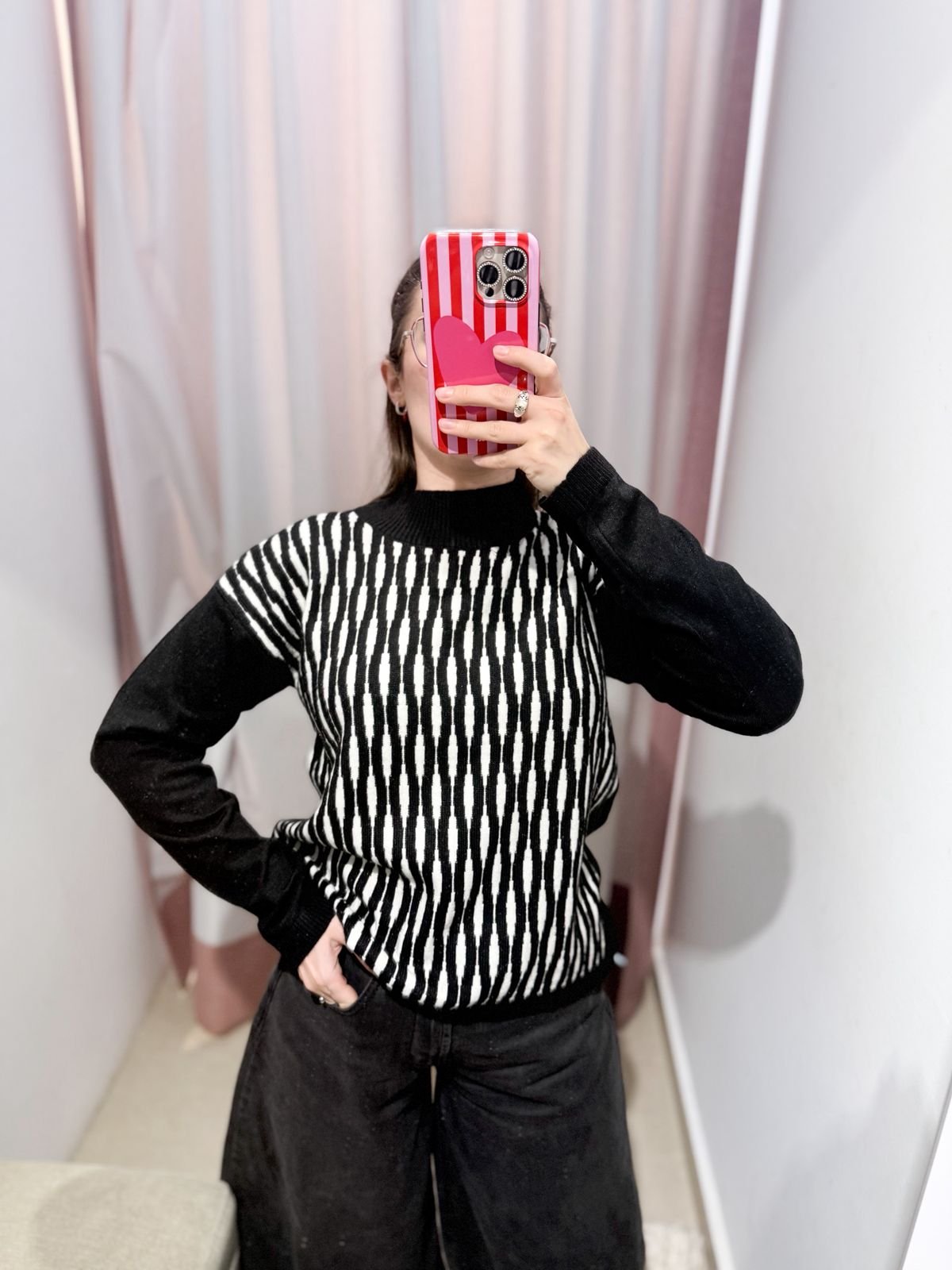 weater tramado con espalda en color negro, se caracteriza cpor su tejido con relieve, combinando el color blanco y negro en el frente