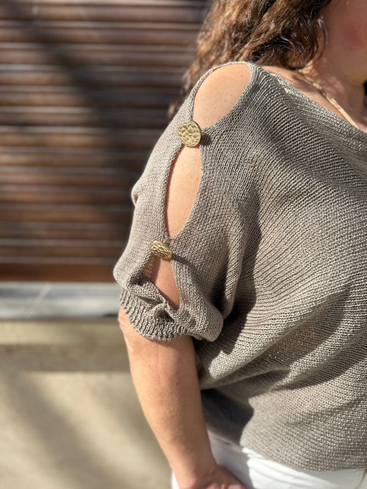 SE CARACTERIZA POR SU DETALLE EN HOMBROS Y MANGAS ABIERTAS CON APLICACIONES DORADAS