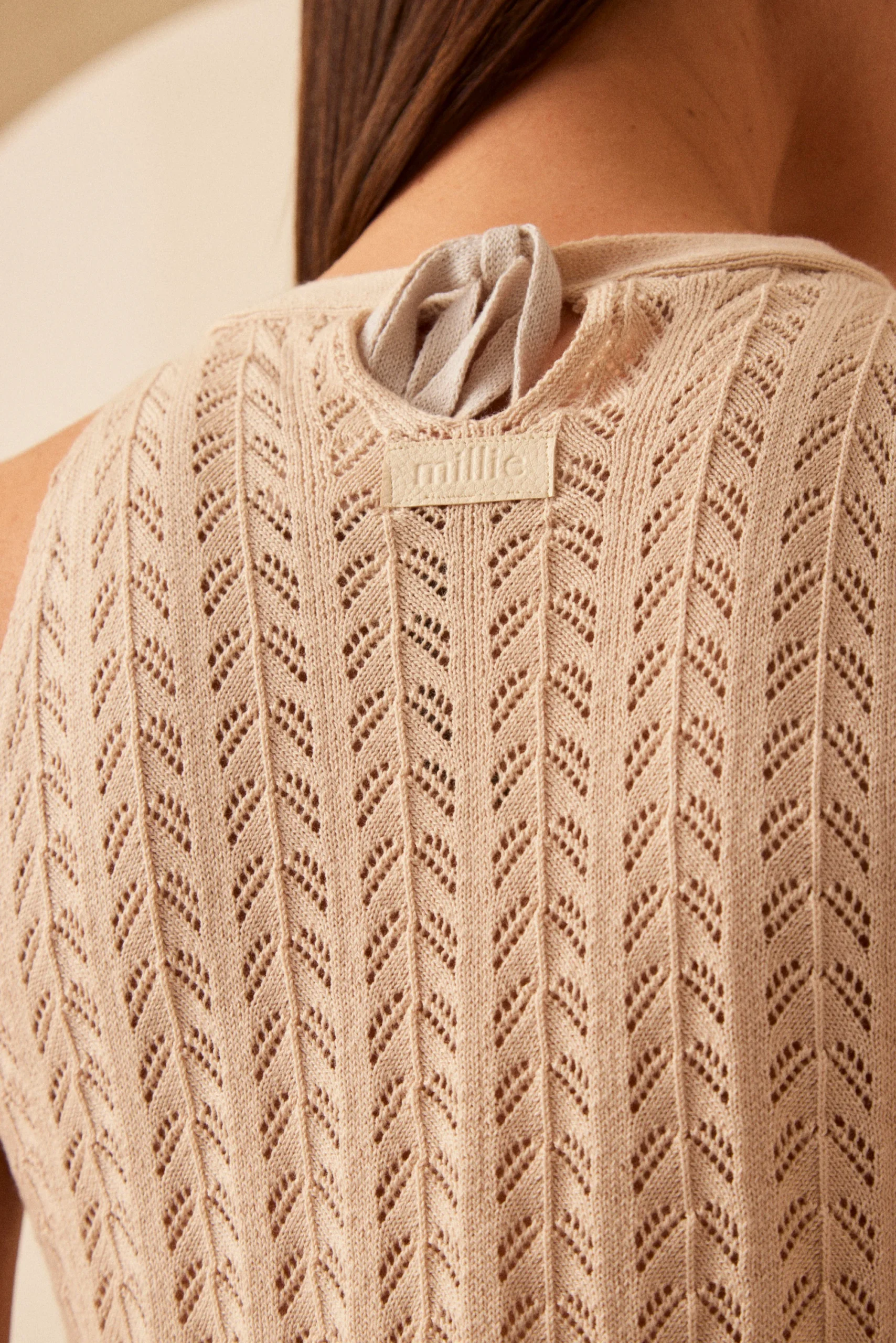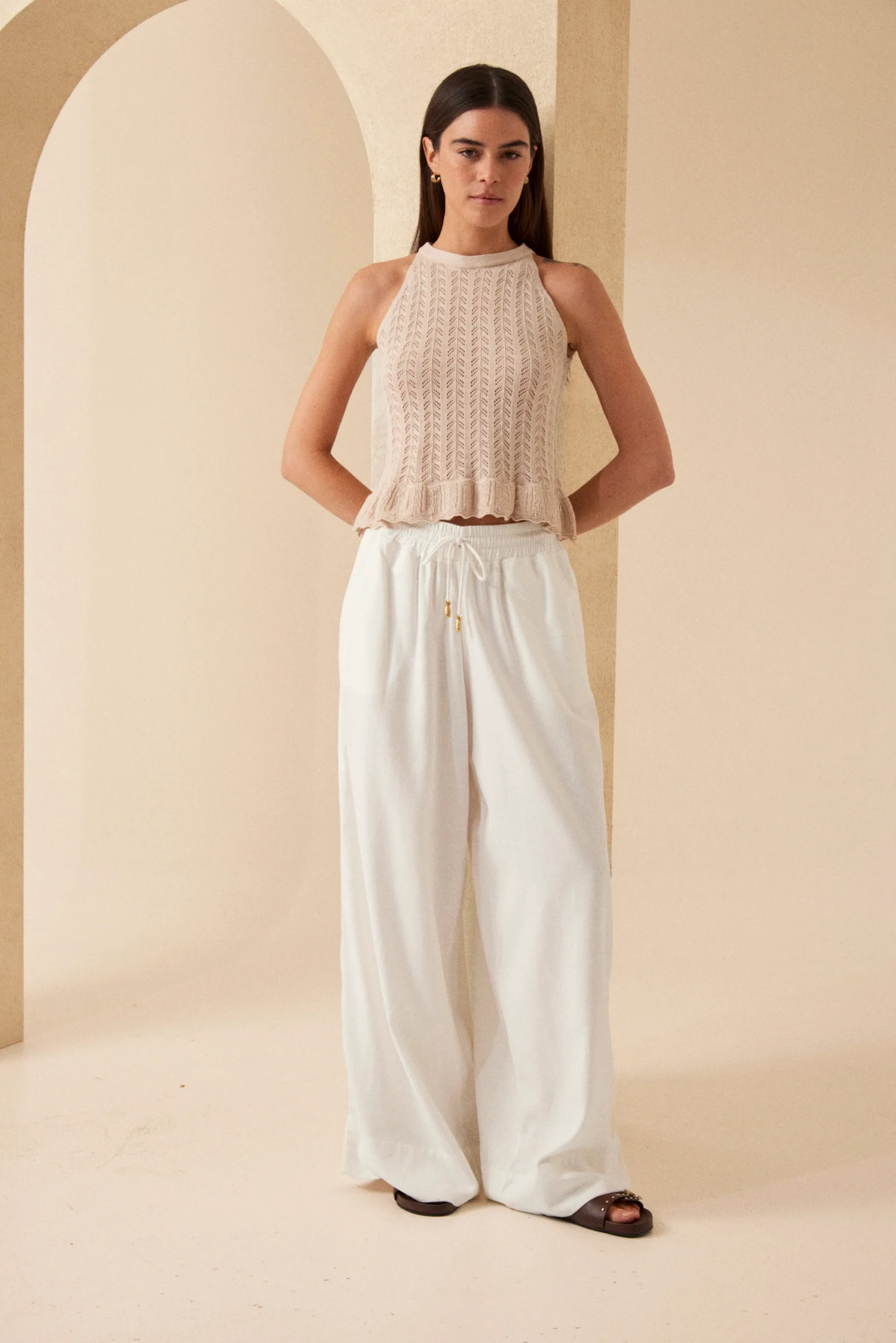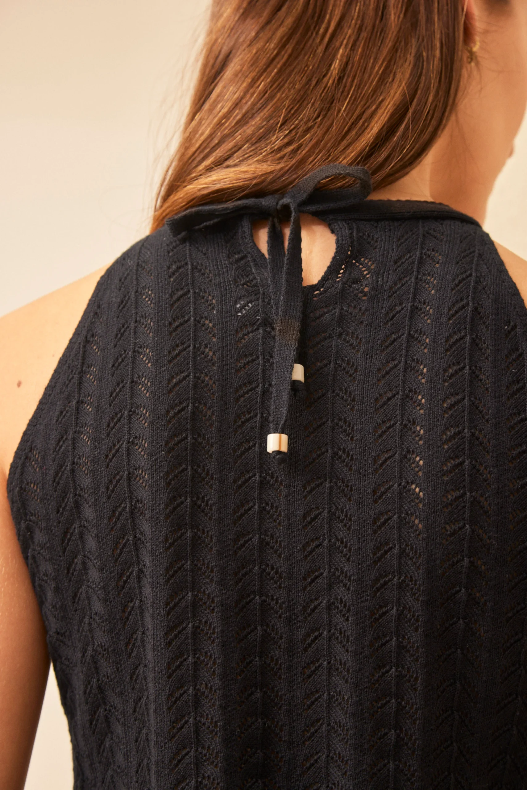 Top halter tejido en punto calado con volado en el ruedo y lazo para atar en el cuello.