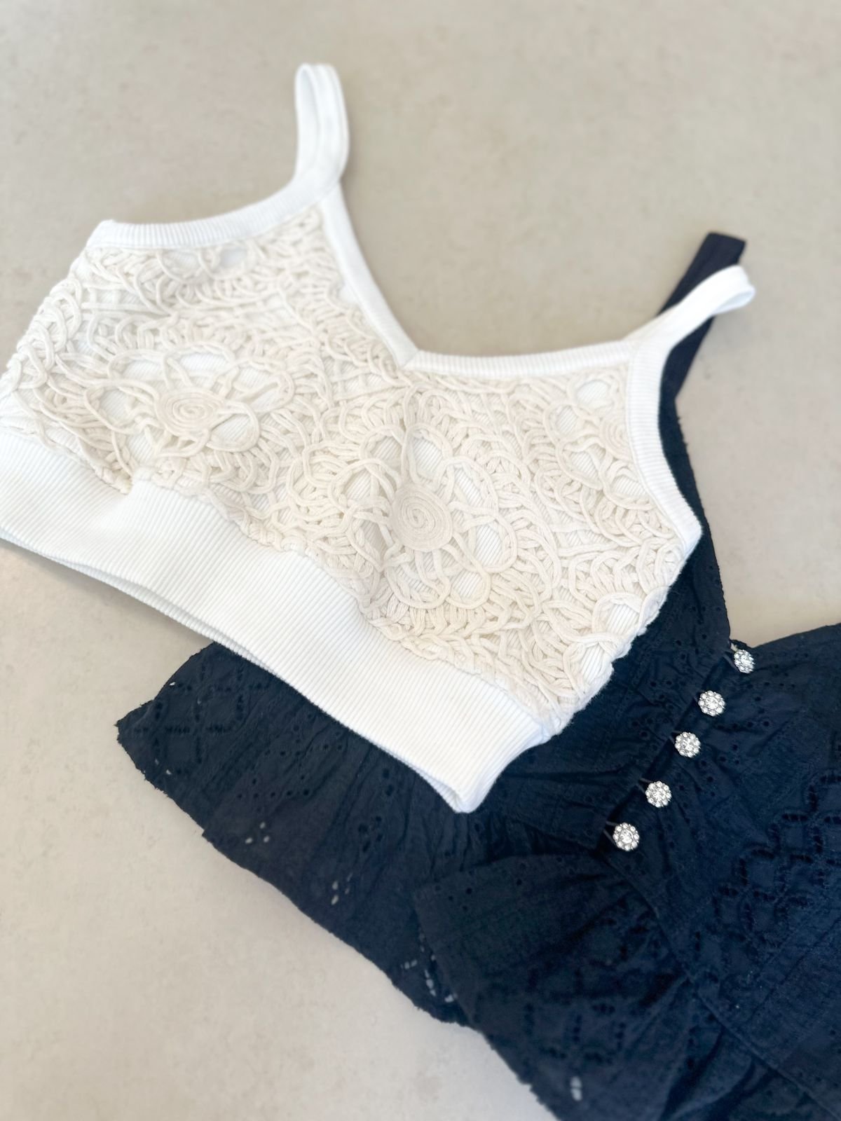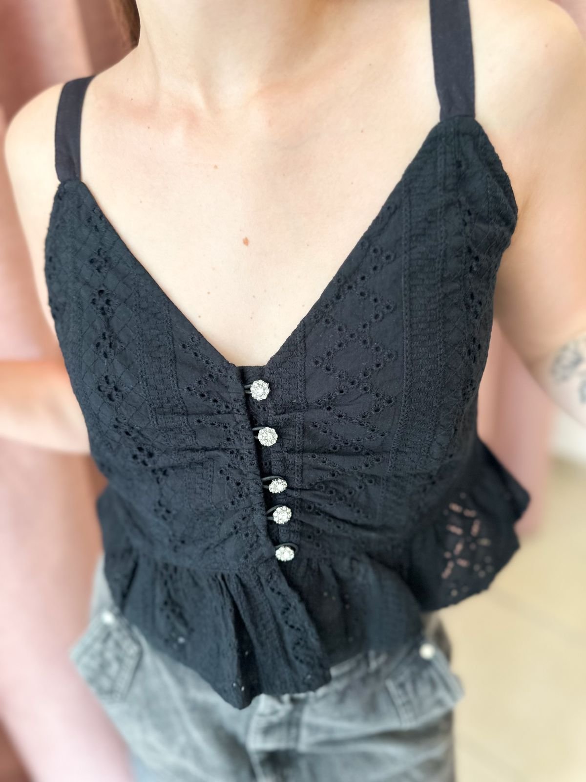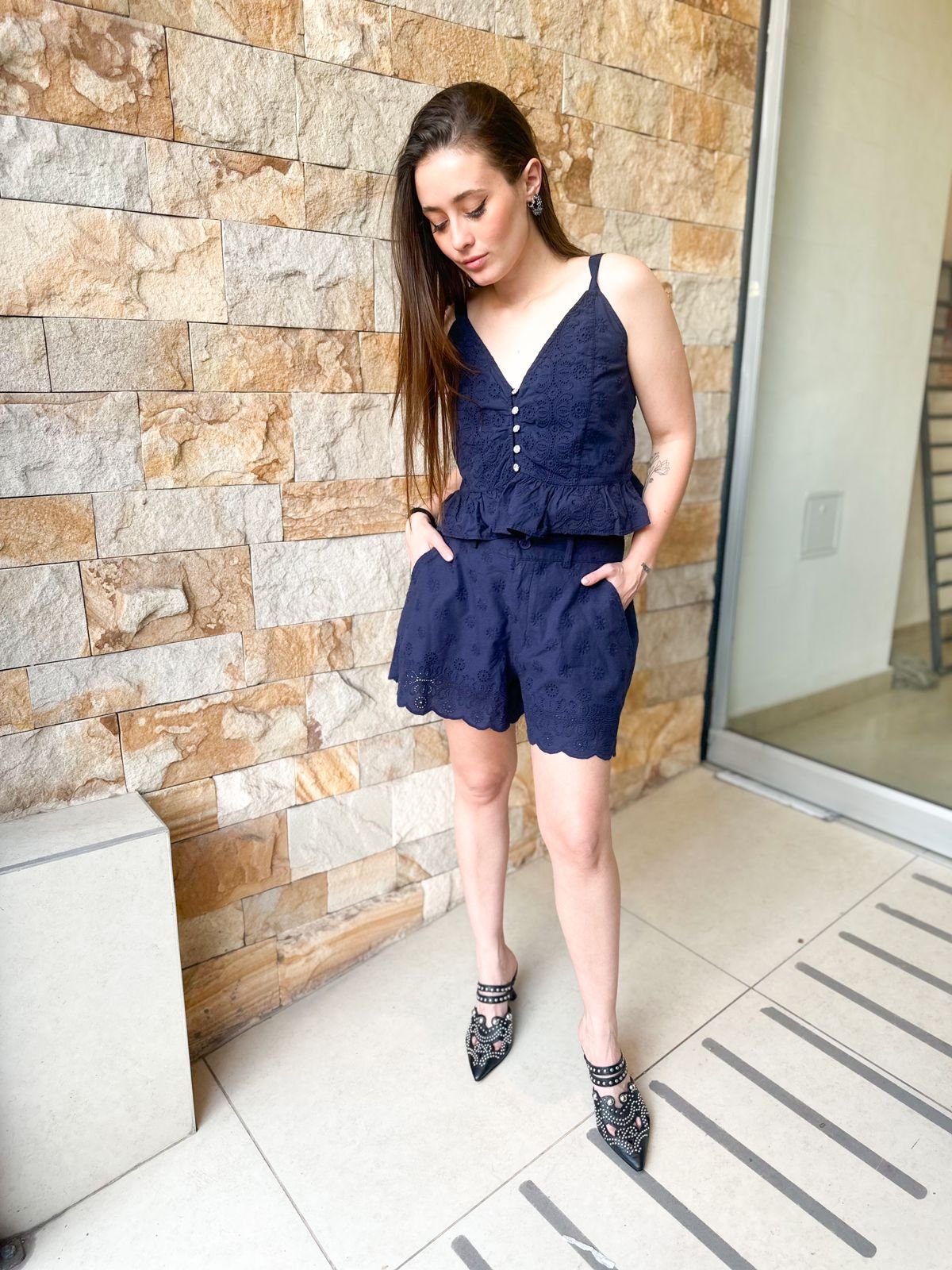 El Top Orin está confeccionado en broderie y posee forro a tono. Su escote delantero es en V, presenta breteles finos regulables y elástico en la espalda para mejorar su calce. Se destaca por volados a la altura de cintura y su prendedura con botones de strass.