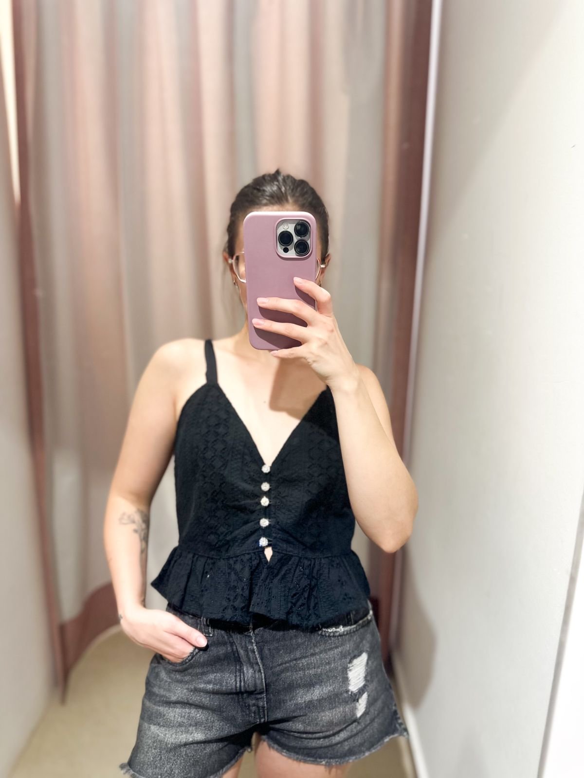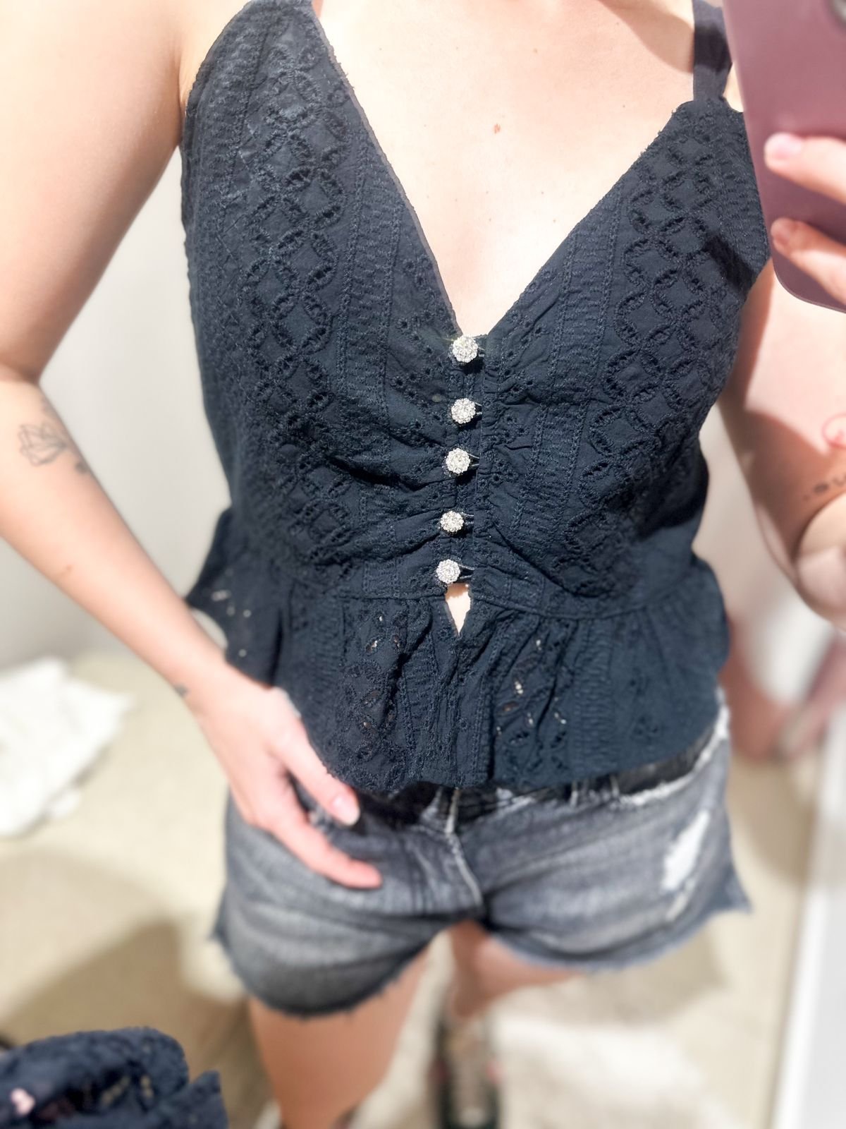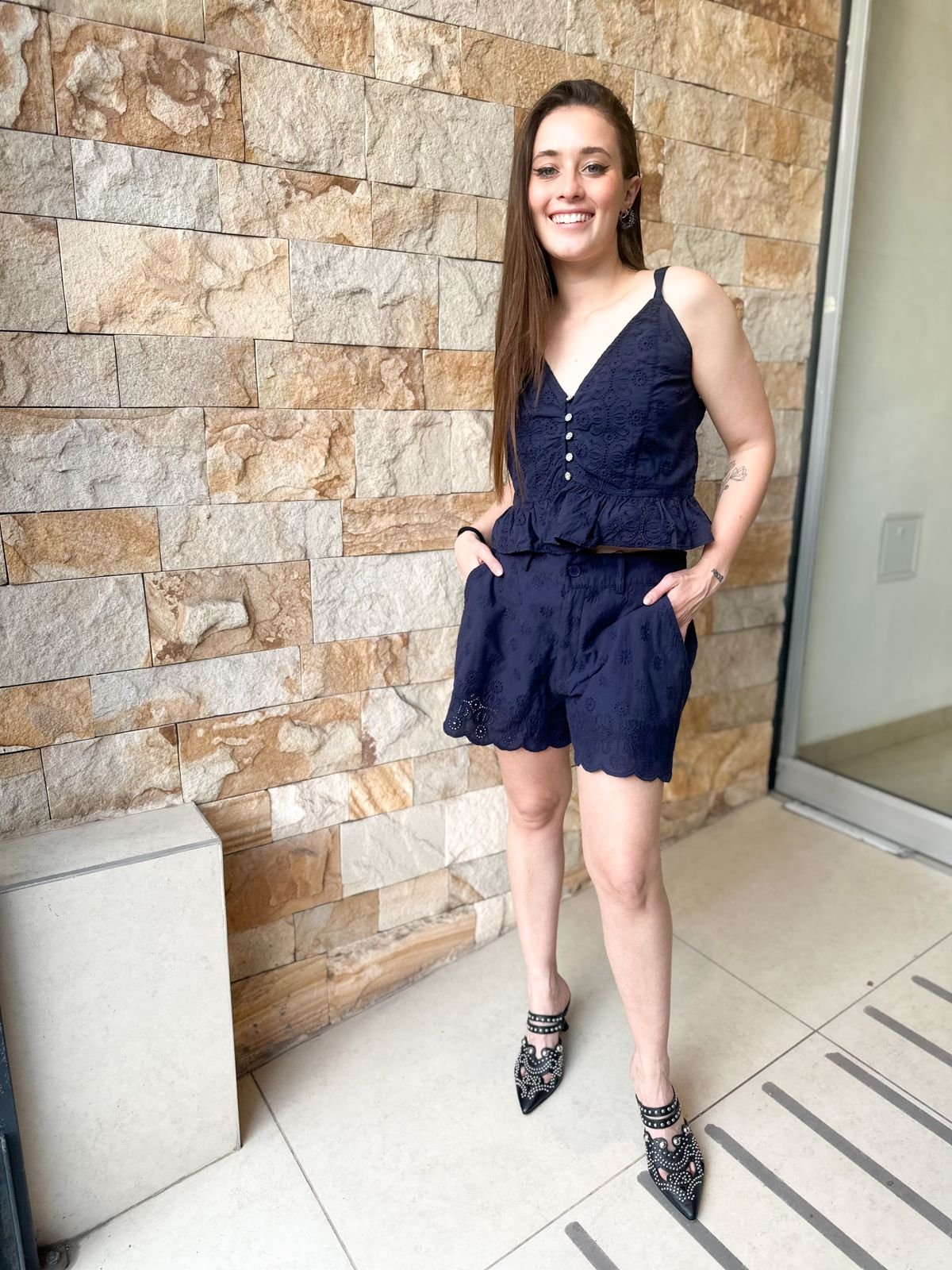 El Top Orin está confeccionado en broderie y posee forro a tono. Su escote delantero es en V, presenta breteles finos regulables y elástico en la espalda para mejorar su calce. Se destaca por volados a la altura de cintura y su prendedura con botones de strass.