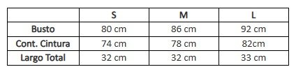 BUSTO: 86 CM / CINTURA: 78 CM / LARGO TOTAL: 32 CM