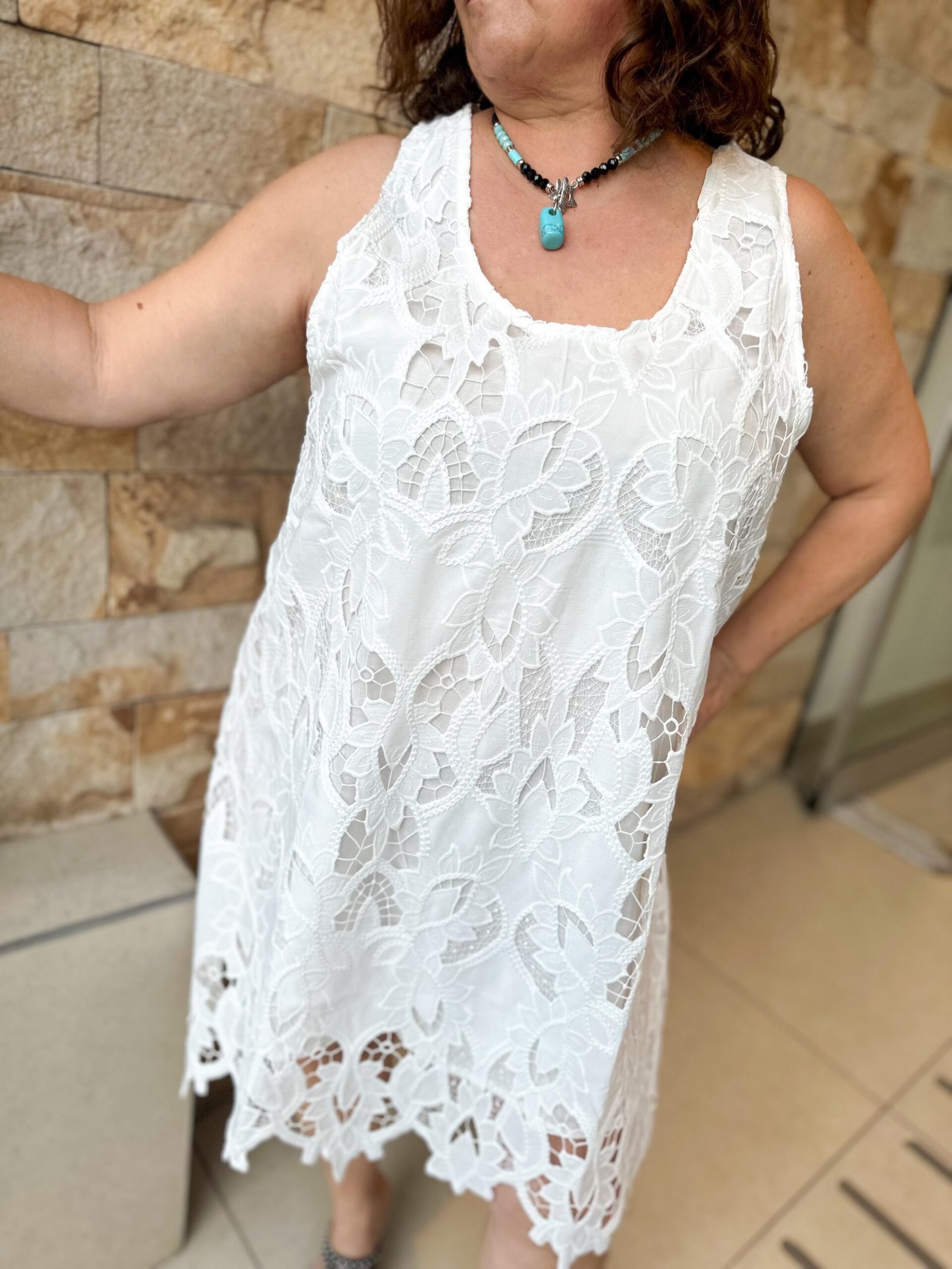 VESTIDO A LA RODILLA CONFECCIONADO EN ALGOÓN CON FRENTE DE BRODERIE.