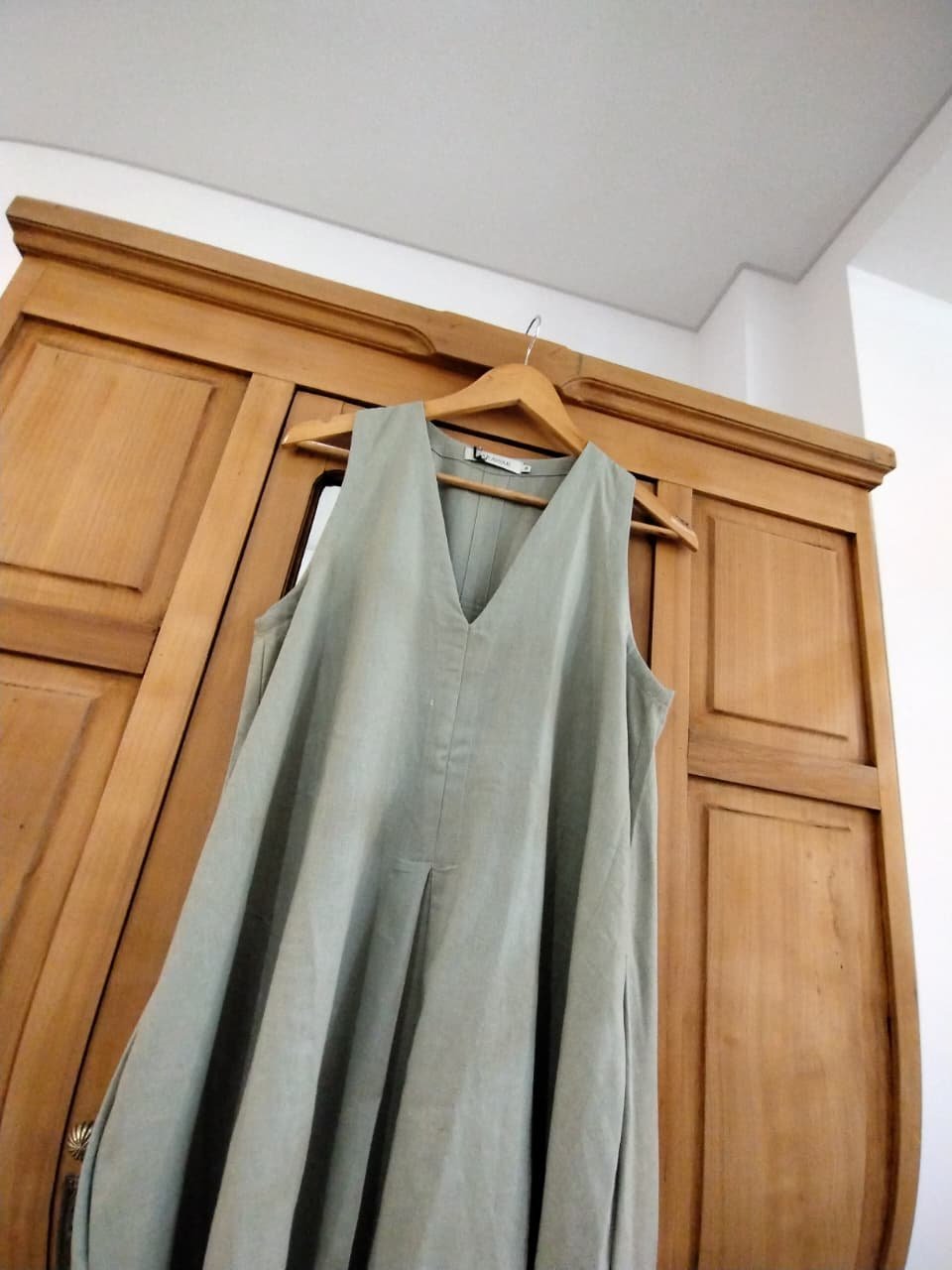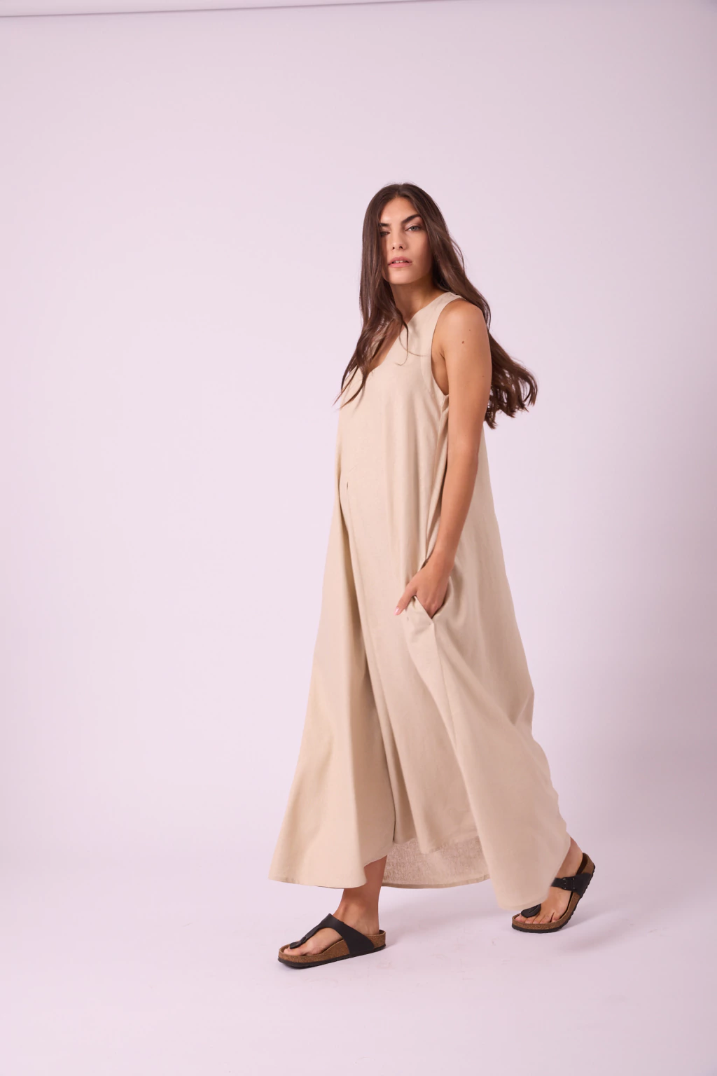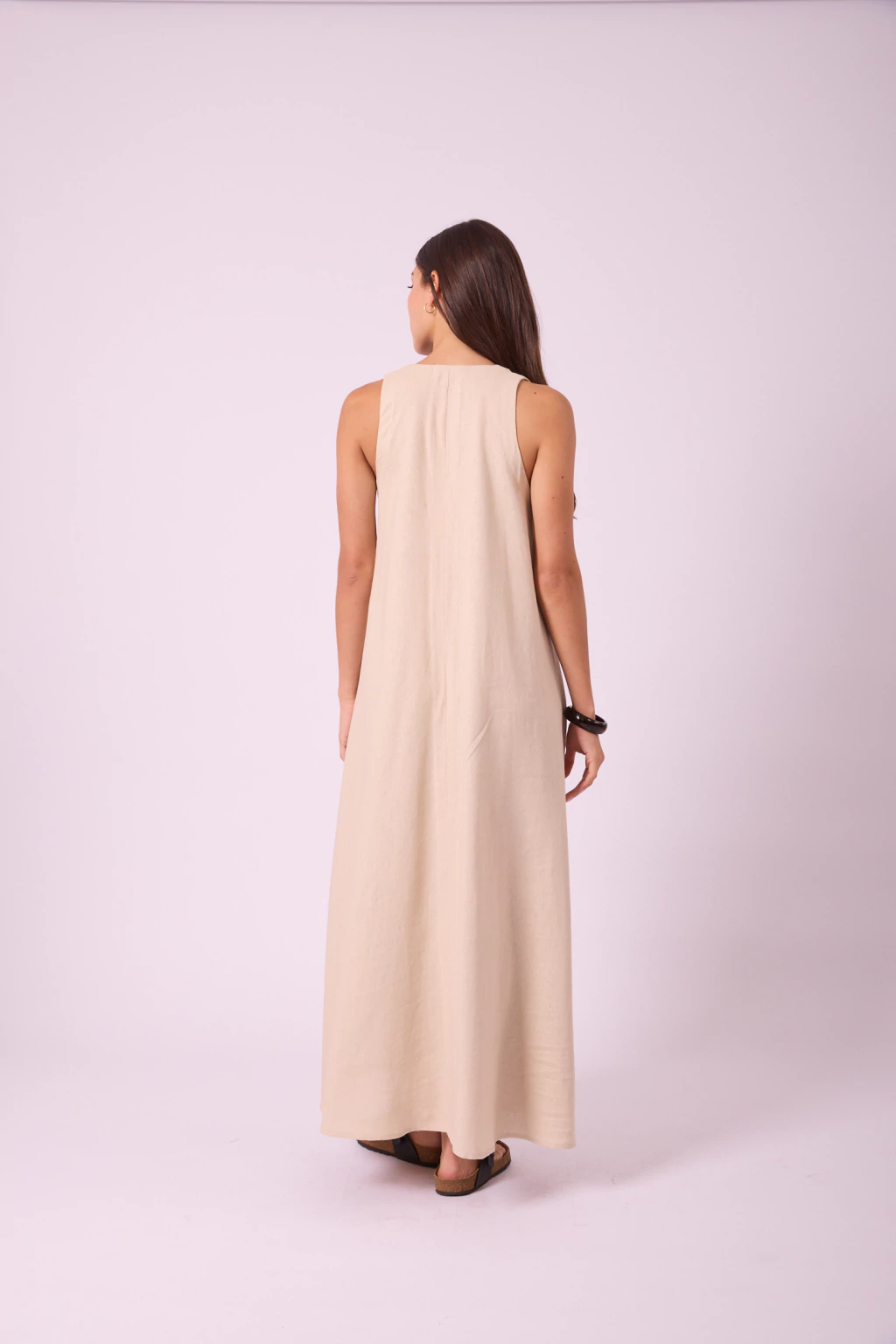 VESTIDO LARGO CONFECCIONADO EN LINO, ES DE SIILUETA SUELTA, ESCOTE V