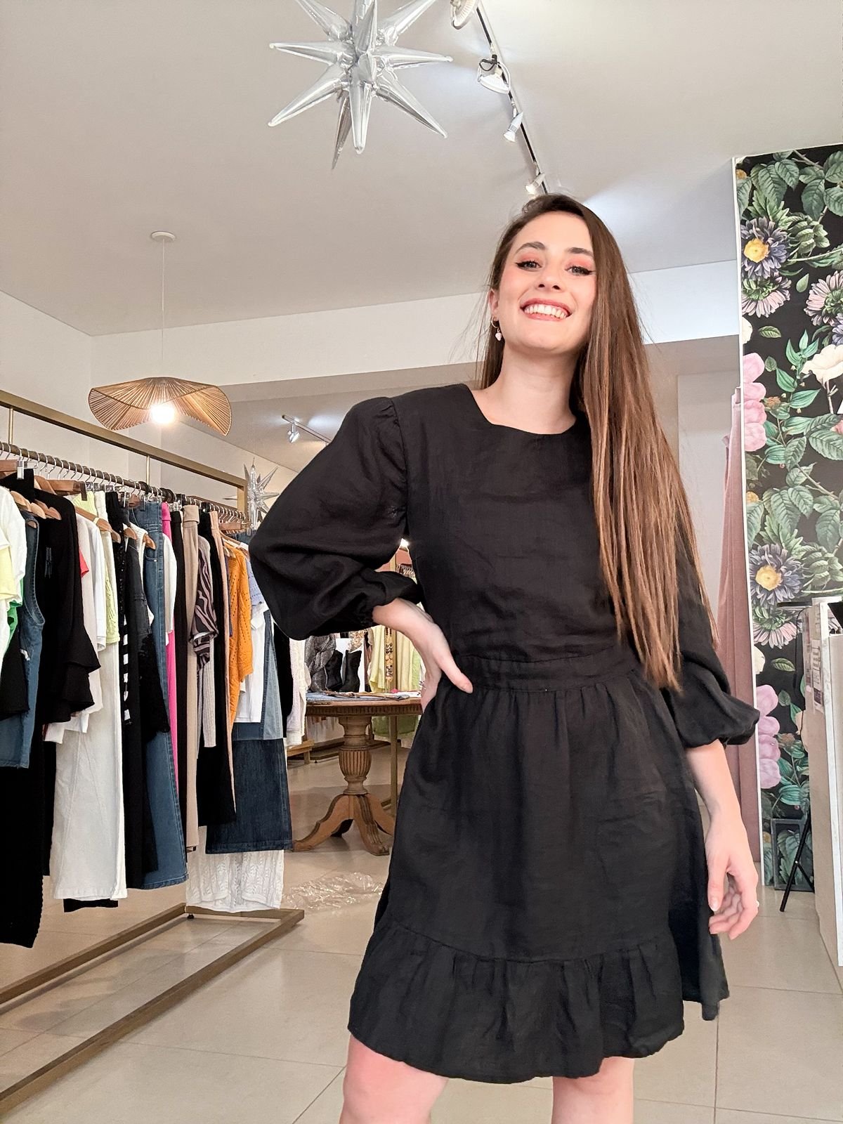 VESTIDO CONFECCIONADO EN LINO. CORTE A, LARGO A LA RODILLA CON VUELO INFERIOR. MANGA LARGA PRINCESA CON PUÑO ELASTIZADO