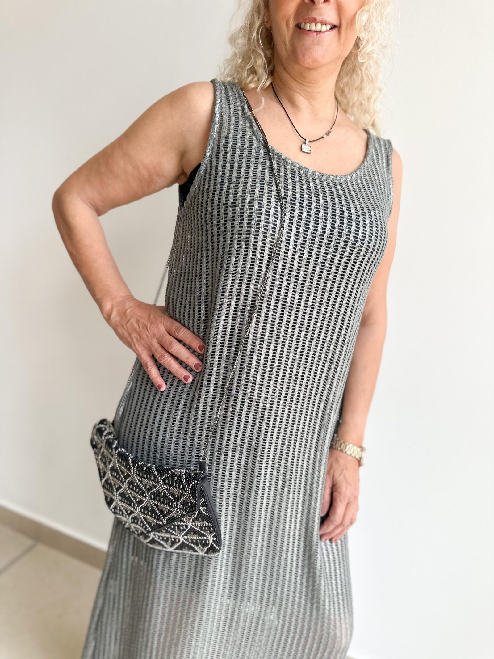 Vestido tipo red con detalles en foil lo cual le otorgan un brillo especial, es largo y viene con una enagua color negra con breteles finitos, incluida pero desmontable para poder usarlo con ella o por separado