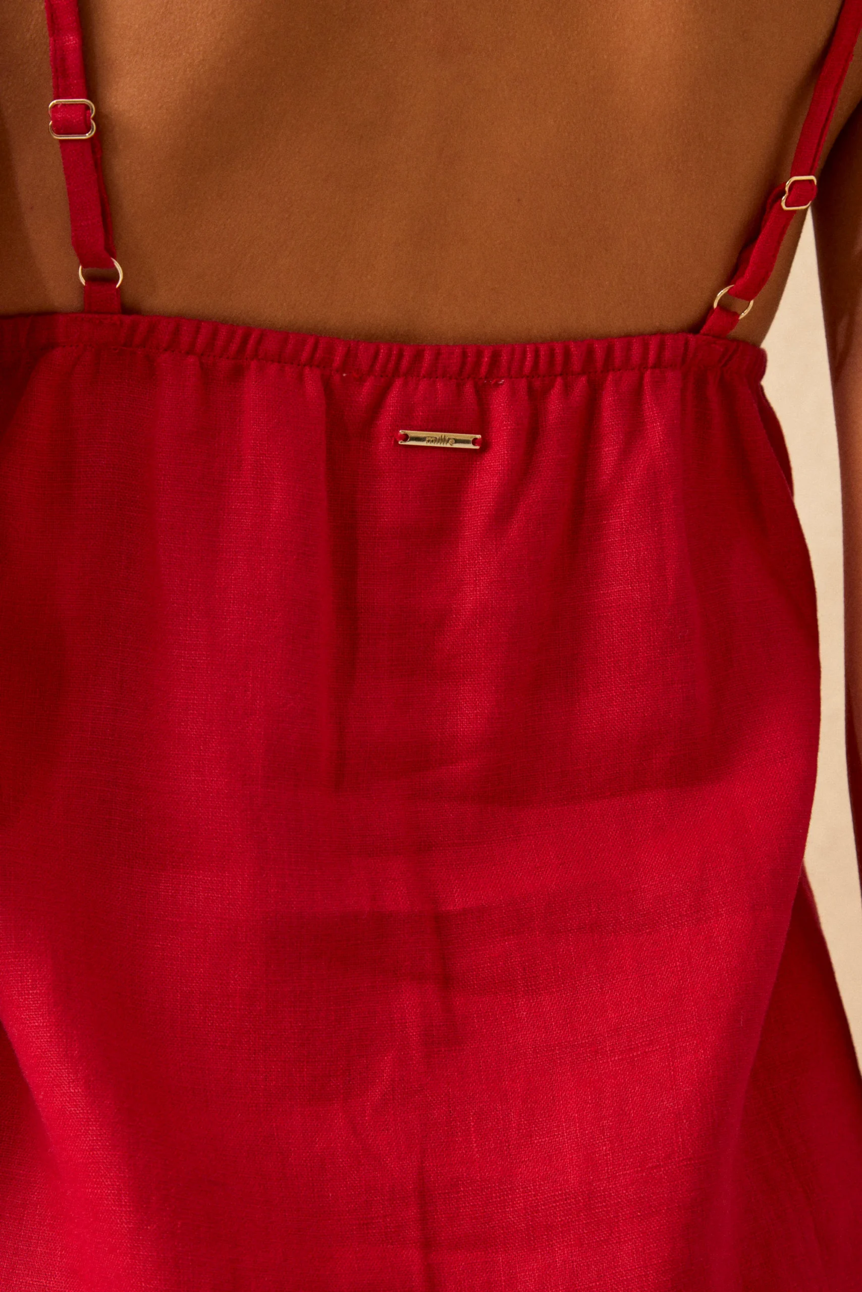 Vestido corto de 100% lino. Lleva diseño bordado y calado en el escote y breteles regulables. Tiene espalda elastica y chapita metálica Millie.
