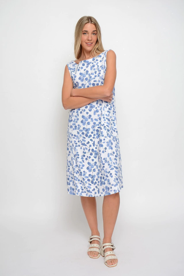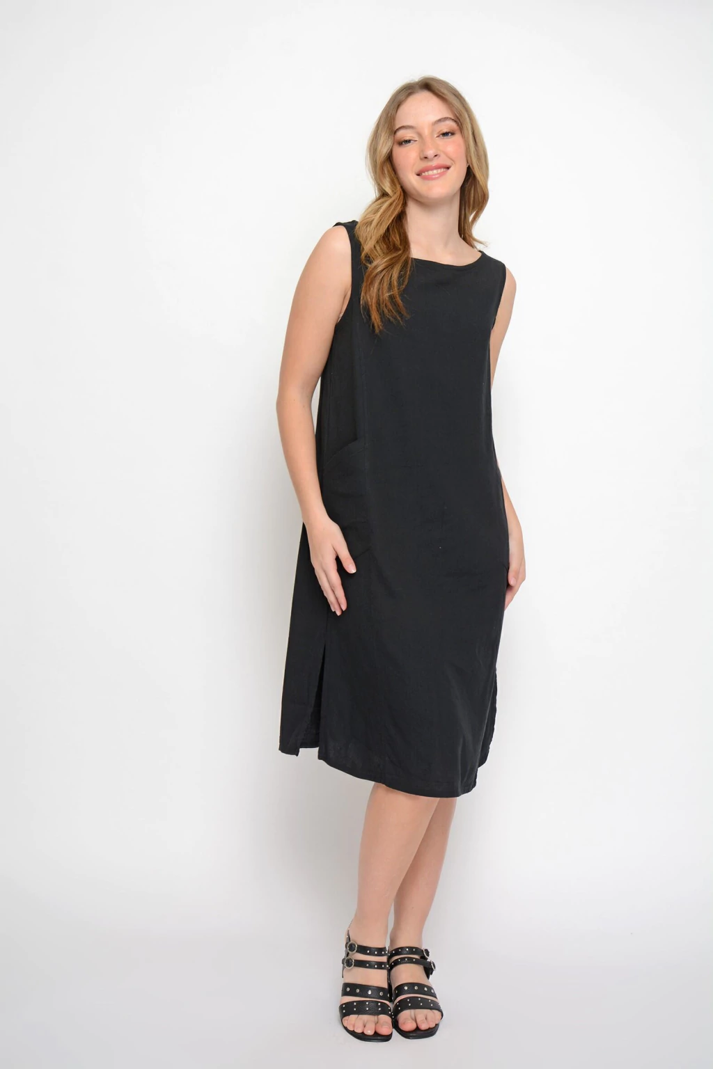 VESTIDO SIN MANGAS CONFECCIONADO EN LINO CON LYCRA, DE CUELLO BOTE CON BOLSILLOS, DE CORTE RECTO, AL CUERPO. LARGO MIDI